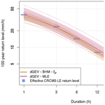 Lastly, we construct IDF curves from the parameter estimates of dGEV models. The rainfall return level at a given duration d and return period T is: