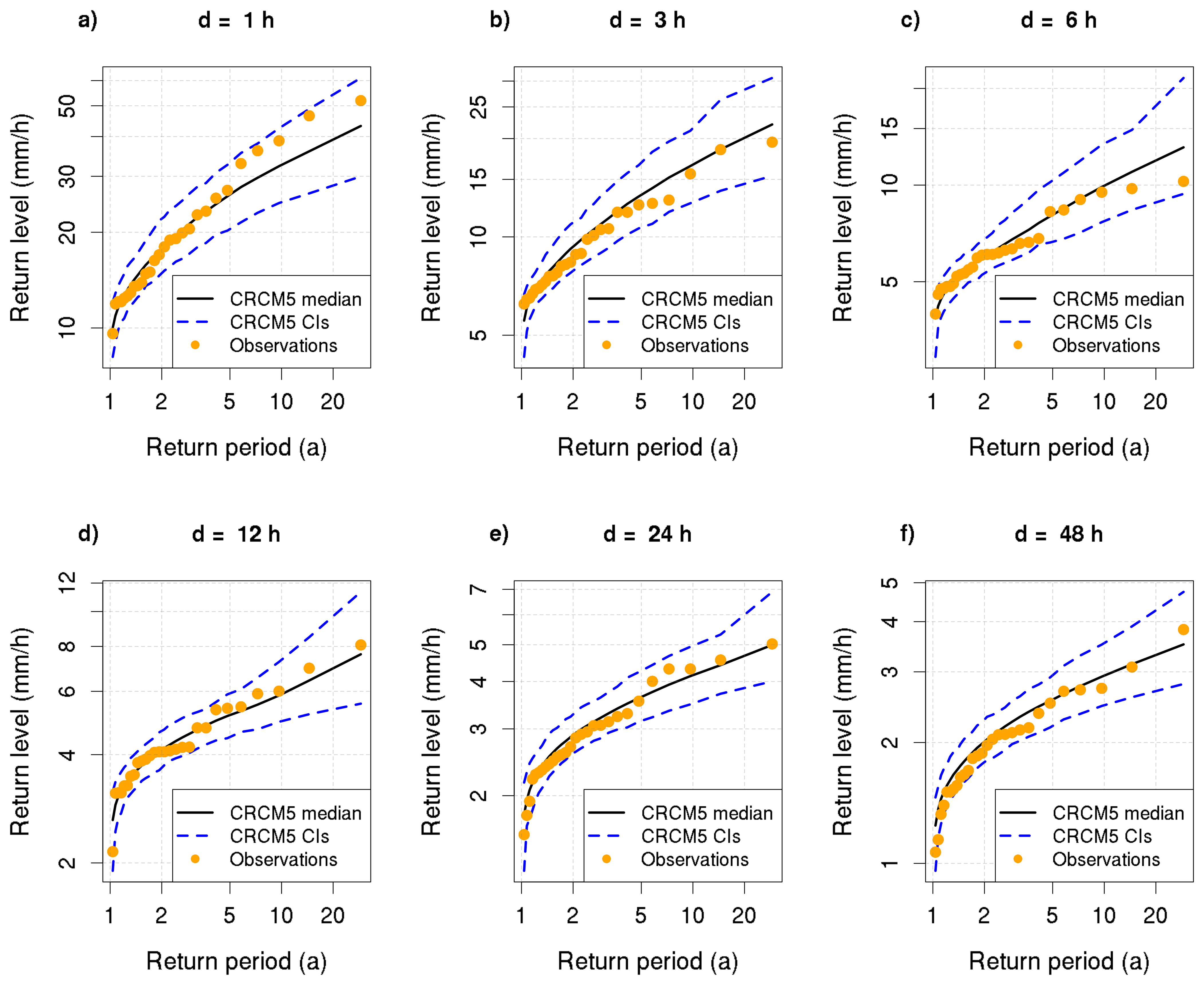 Figure 2Return-level curves for the locality of Freudenstadt for durations (a) 1 h, (b) 3 h, (c) 6 h, (d) 12 h, (e) 24 h, (f) 48 h. Return level curves of CRCM5-LE are marked in the black line and 95 % confidence intervals in blue dashed line. The confidence intervals are obtained via bootstrap resampling. The annual maxima of the observational data (German weather service – Climate Portal) are plotted via Weibull plotting positions as the orange circles.