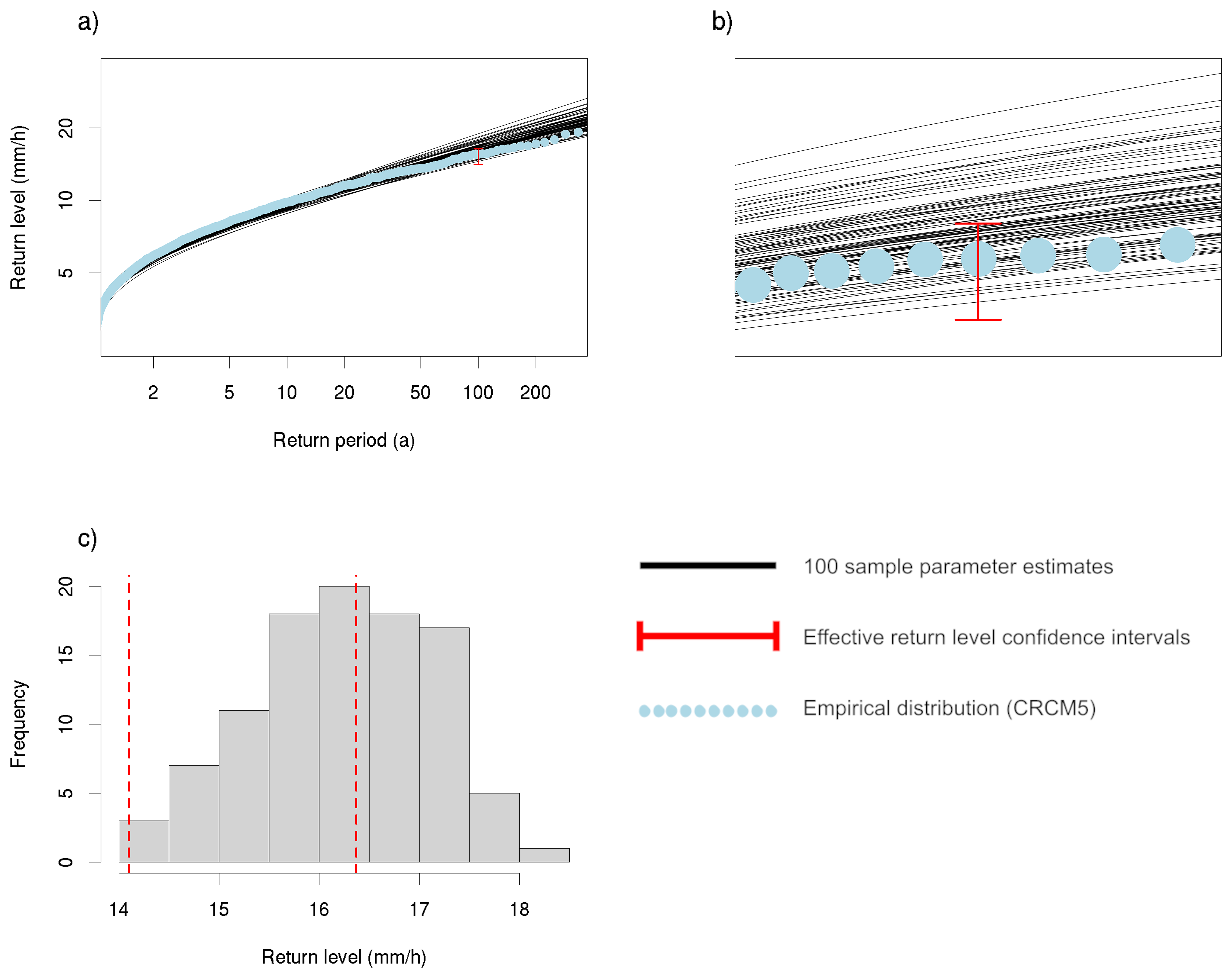 A major disadvantage of many studies is the limitation due to small sample sizes (Marra et al., 2018), especially for observations, but also in many high-resolution climate model simulations, which typically provide only decadal to 30-year simulations (Ban et al., 2020; Lucas-Picher et al., 2021; Poschlod and Daloz, 2024). This makes it difficult to reliably estimate changes in rare events like climate extremes. Long model runs or large ensembles are a way to overcome this limitation because they provide a “ground truth” for assessing the appropriate size of smaller samples while also offering extensive, gap-free time series (Stein, 2020). Using millenial-scale global climate model simulations, Huang et al. (2016) investigate changes of temperature extremes between pre-industrial and future climates in the contiguous United States, applying the GEV distribution. They show that using 20- and 50-year subsets of the full 1000-year simulation for GEV fitting can lead to poor estimates of rare return levels that might strongly distort climate change signals. Large ensembles of regional climate models can be employed to robustly assess extreme precipitation at finer spatial scales (Aalbers et al., 2018; Brönnimann et al., 2018; Poschlod et al., 2021) or precipitation extremes occurring jointly with extreme wind speed (Huang et al., 2021), storm surge (van den Hurk et al., 2015) or snow melt (Poschlod et al., 2020). In this study, we employ the Canadian Regional Climate Model Large Ensemble (CRCM5-LE; (Leduc et al., 2019)) for the period 1980 to 2019, offering 50 realizations of the climate and therefore providing a homogeneous sample of 2000 years. These 50 realizations of the large ensemble differ only due to minor perturbations in the initial conditions – the subsequent variability can be interpreted as a model representation of internal climate variability (Deser et al., 2020). Large ensembles enable robust inferences about rare events and allow for accurate estimation of extremes from the full model output (Stein, 2020). Here, we mimic the typical situation of data availability of station observations and artificially select individual grid cells as localities with sub-sample sizes ranging from 30 to 100 years. With 2000 years of data available, we can empirically obtain “effective return levels” as our ground truth, assessing the ability of various extreme value models to reproduce the true return levels from the sub-samples. Martel et al. (2020) used three large ensembles, including the CRCM5-LE, to analyze extreme precipitation events. They also utilizes bootstrapping to estimate projected confidence intervals. Kharin et al. (2007) uses multimodel ensembles to account for natural variability. Similar to our approach, a GEV is utilized in 20-year effective return levels are also used for validation. In a further paper, Kharin et al. (2013) also used large ensembles and GEVs in analyzing extremes. Similar our work, model performances were also evaluated using large ensembles.