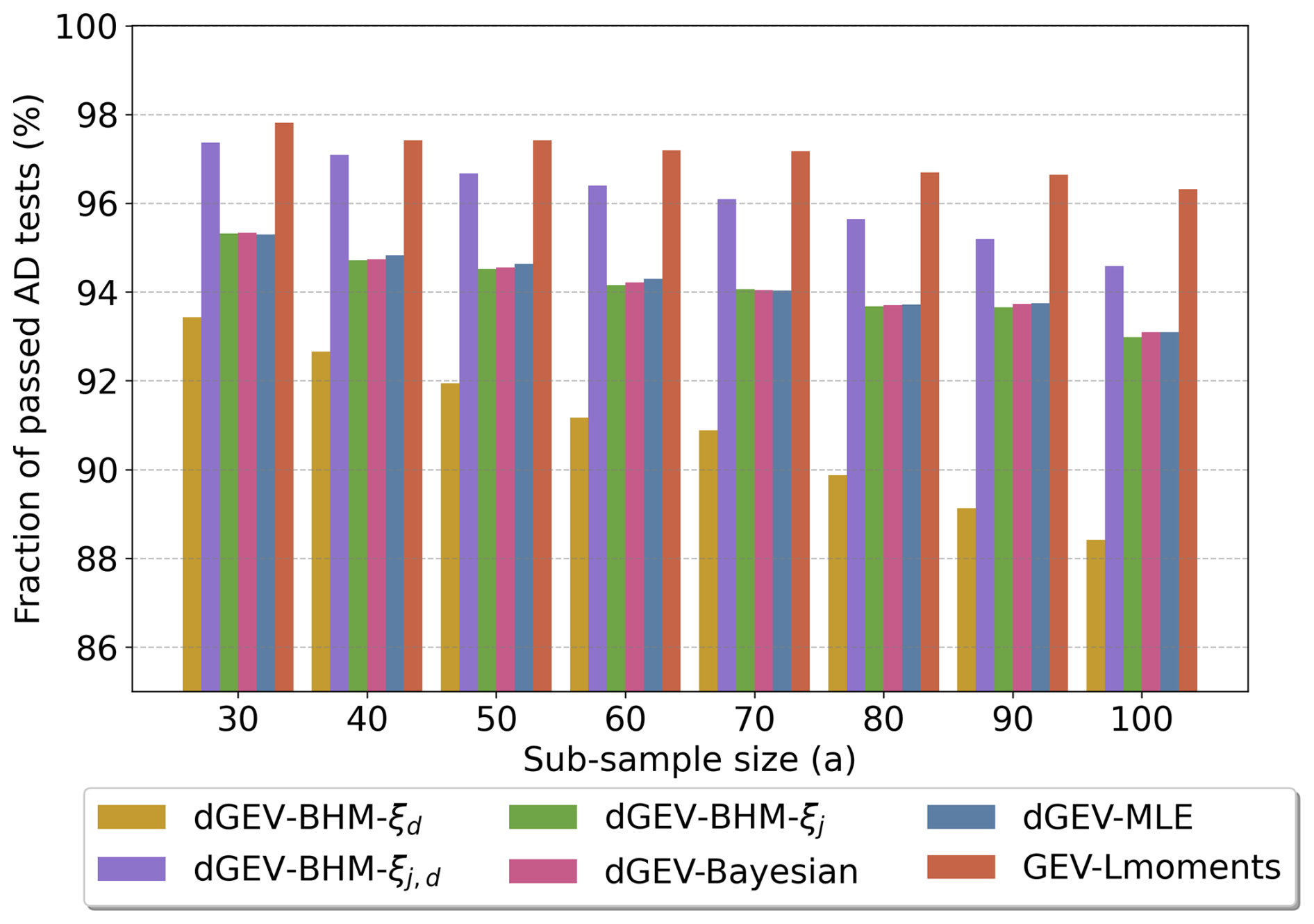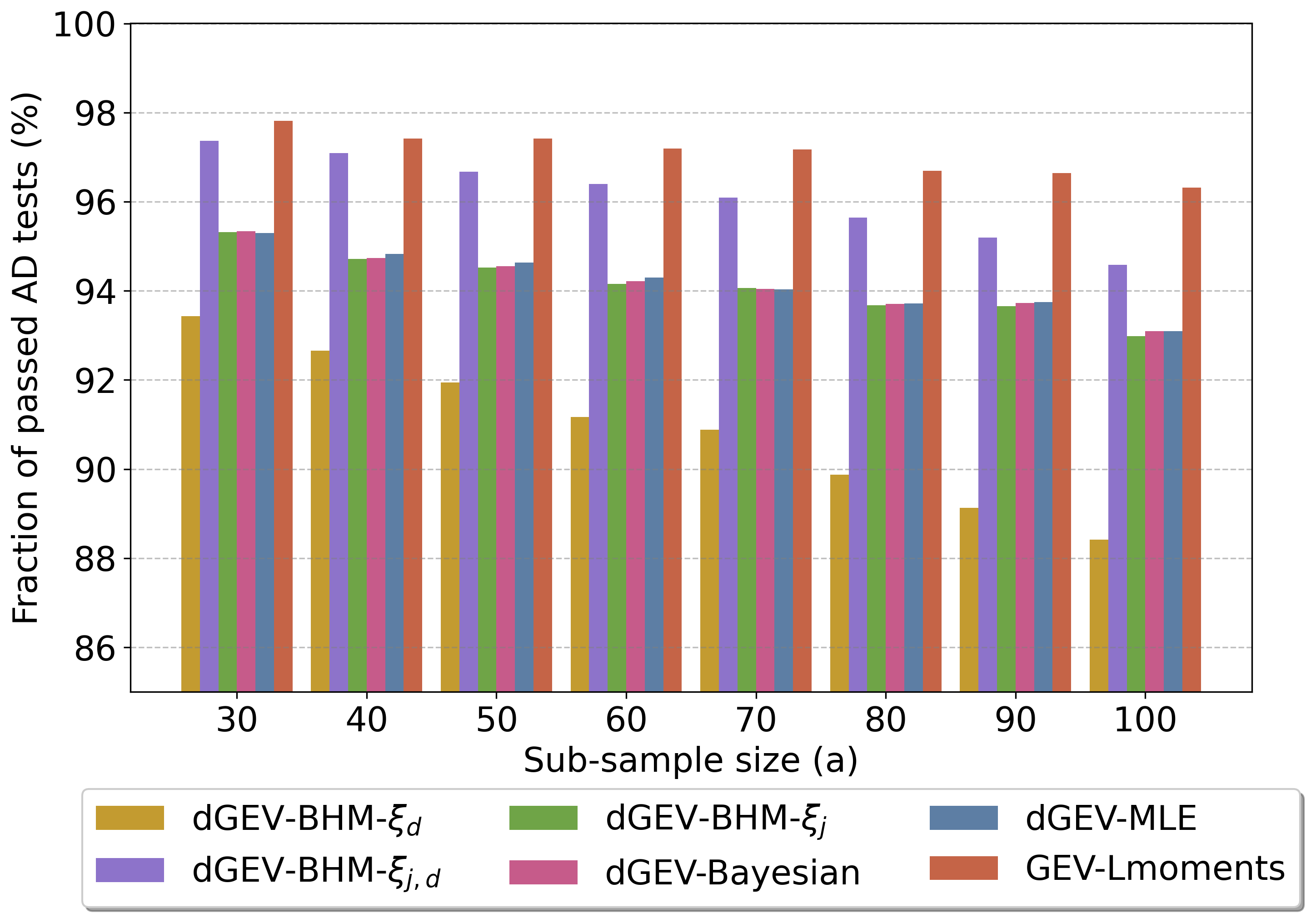 First, we present the results of the AD test, as the goodness-of-fit evaluation would be the typical next step after the fitting of EVT models. Figure 5 illustrates the fraction of passed AD tests for all 25 localities, 6 durations, and 100 sub-samples across the 8 sub-sample sizes between 30 and 100 years. Given the significance level of α=0.05, a 95 % fraction of passed AD tests would be expected if all data samples came from the tested theoretical distribution specified by the EVT model fits. We see that the overall test results decrease with increasing sample sizes, as the AD test gains more power to reject the null hypothesis detecting deviations between the sample and the theoretical distribution (Shin et al., 2012). The AD test diagnoses the highest rejection rates for the dGEV-BHM-ξd. The dGEV-BHM-ξj, dGEV-Bayesian, and dGEV-MLE reach 95 % acceptance for 30-year samples dropping to 93 % for 100-year samples. The dGEV-BHM-ξj,d and GEV-Lmoments show the lowest rejection rates. We note that this performance can be linked to the flexibility of the EVT models. The GEV-Lmoments estimates location, scale, and shape parameters separately for each locality and duration providing the highest flexibility to fit the GEV to the samples. With the duration dependence, the dGEV limits the flexibility. The dGEV-BHM-ξj,d is the most flexible version allowing the shape parameter to vary over space and duration (see Table 1). In turn, the dGEV-BHM-ξd fixes the shape parameter over space resulting in the highest rejection rate of the AD test.
