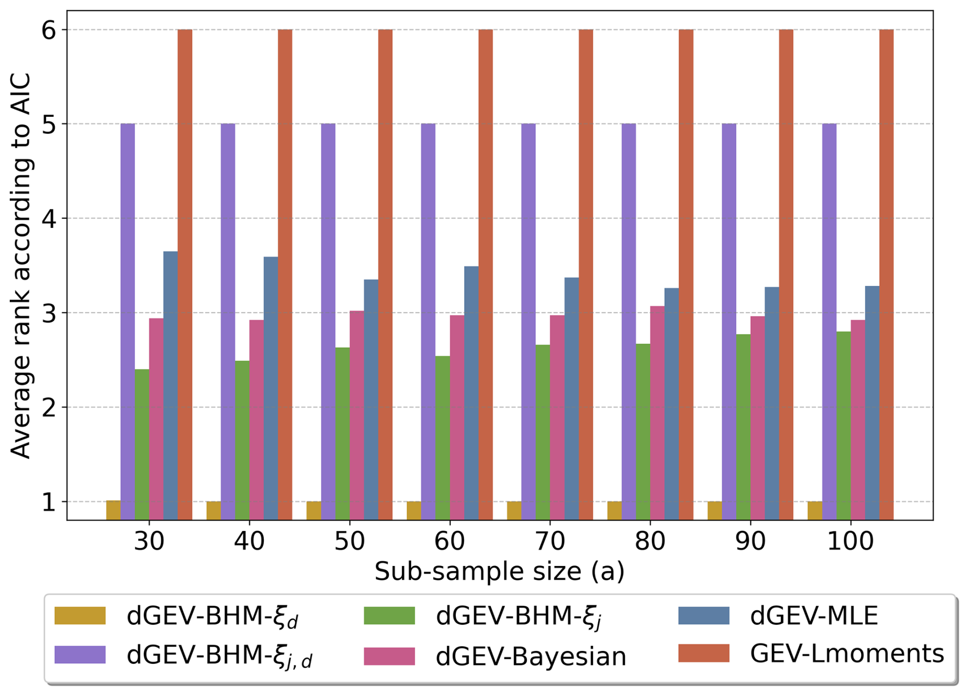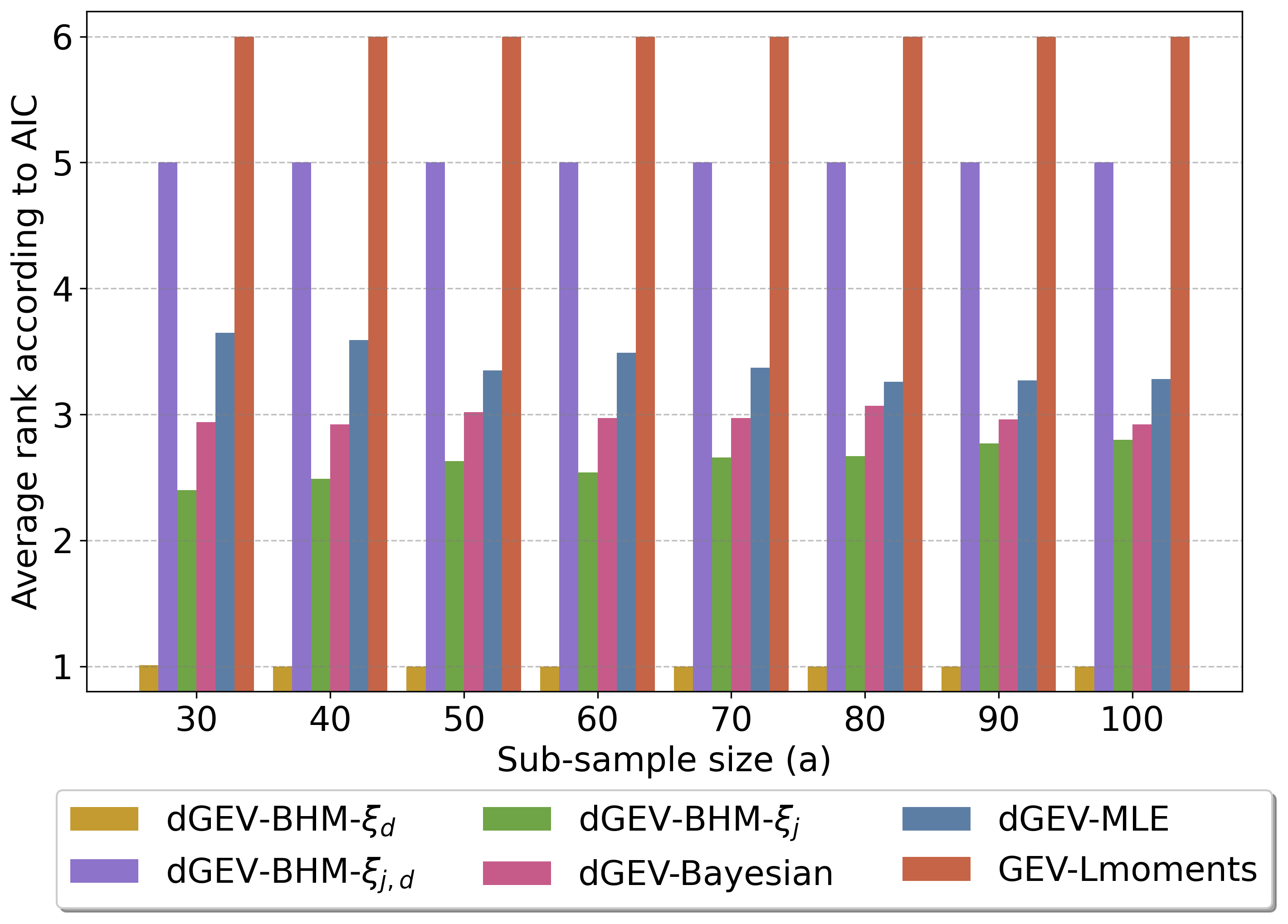 The average ranks according to the AIC values are illustrated in Fig. 6. The dGEV-BHM-ξd model consistently ranks first (the lowest average rank) across all sub-sample sizes, indicating it is the best model choice according to the Akaike Information Criterion (AIC).