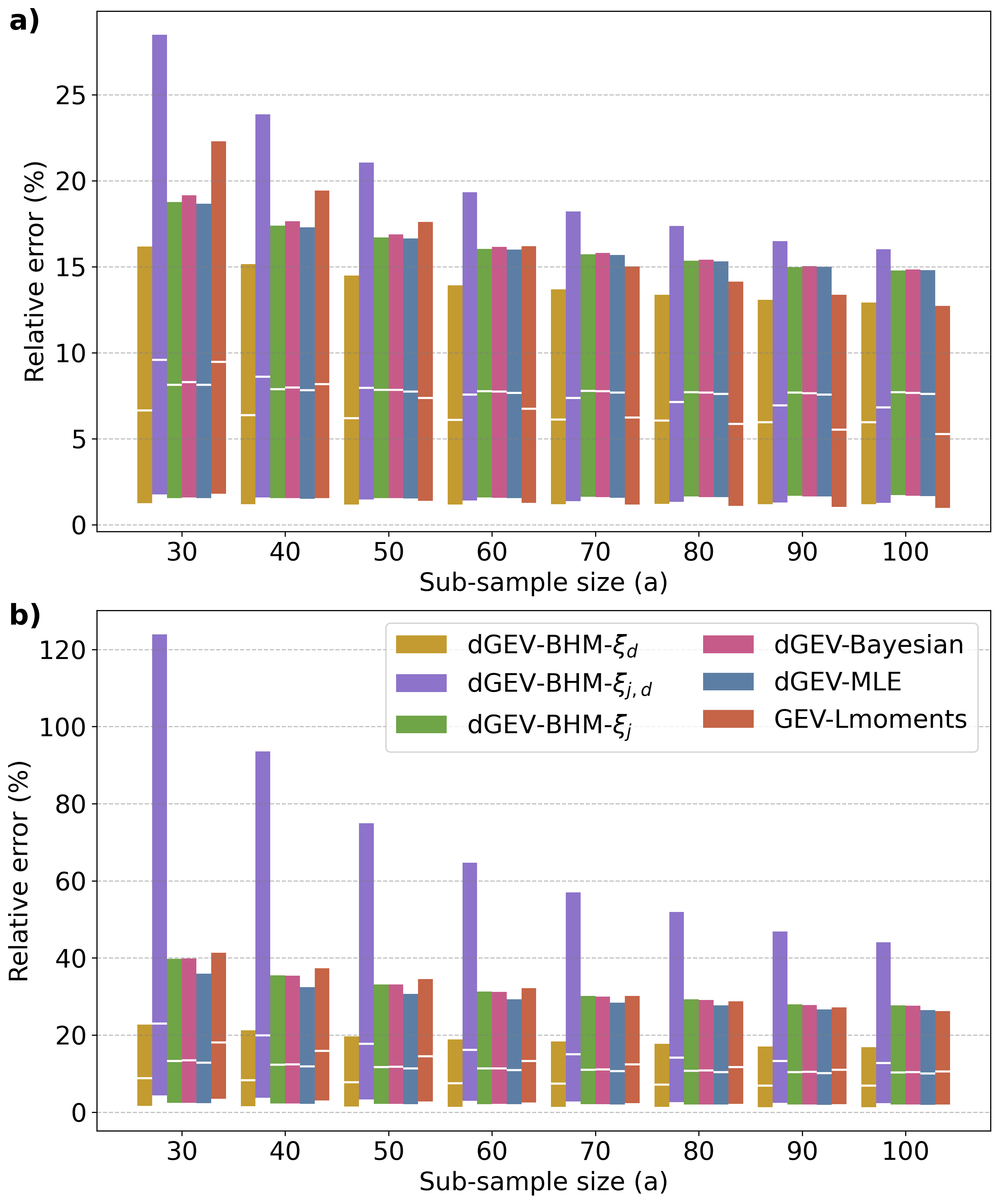 The relative error is presented in Fig. 7 for 10-year and 100-year return levels. The performance of EVT models reveals distinct patterns across varying sub-sample sizes. For the 10-year RE (Fig. 7a)], dGEV-BHM-ξd consistently demonstrates superior performance across sub-sample sizes up to 70 years, with GEV-Lmoments showing the lowest RE for sample sizes of 80 to 100 years. The dGEV-BHM-ξj, dGEV-Bayesian, and dGEV-MLE score very similarly and show low sensitivity to the sample size. Conversely, the dGEV-BHM-ξj,d model exhibits the poorest performance for low sample sizes up to 50 years, but improves for larger samples. In contrast, for the 100-year RE (Fig. 7b), dGEV-BHM-ξd consistently emerges as the most accurate model across all sub-sample sizes. The dGEV-BHM-ξj,d and GEV-Lmoments are identified as the least accurate. Again, dGEV-BHM-ξj, dGEV-Bayesian, and dGEV-MLE show an equivalent accuracy. The robustness of the six EVT models behaves similar for the 10-year and 100-year return levels. The error ranges of the dGEV-BHM-ξj,d are by far the largest showing high sensitivity to the sample size. In turn, the dGEV-BHM-ξd is diagnosed the most robust model consistently across the sub-sample sizes.