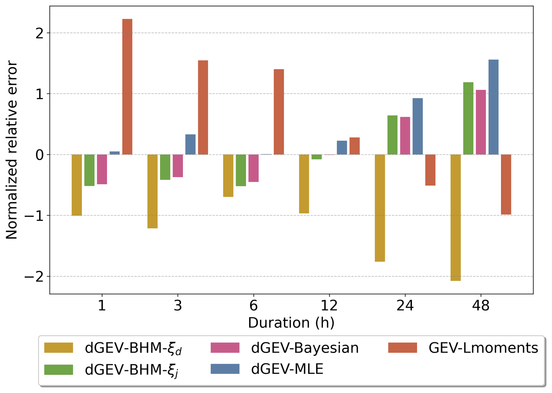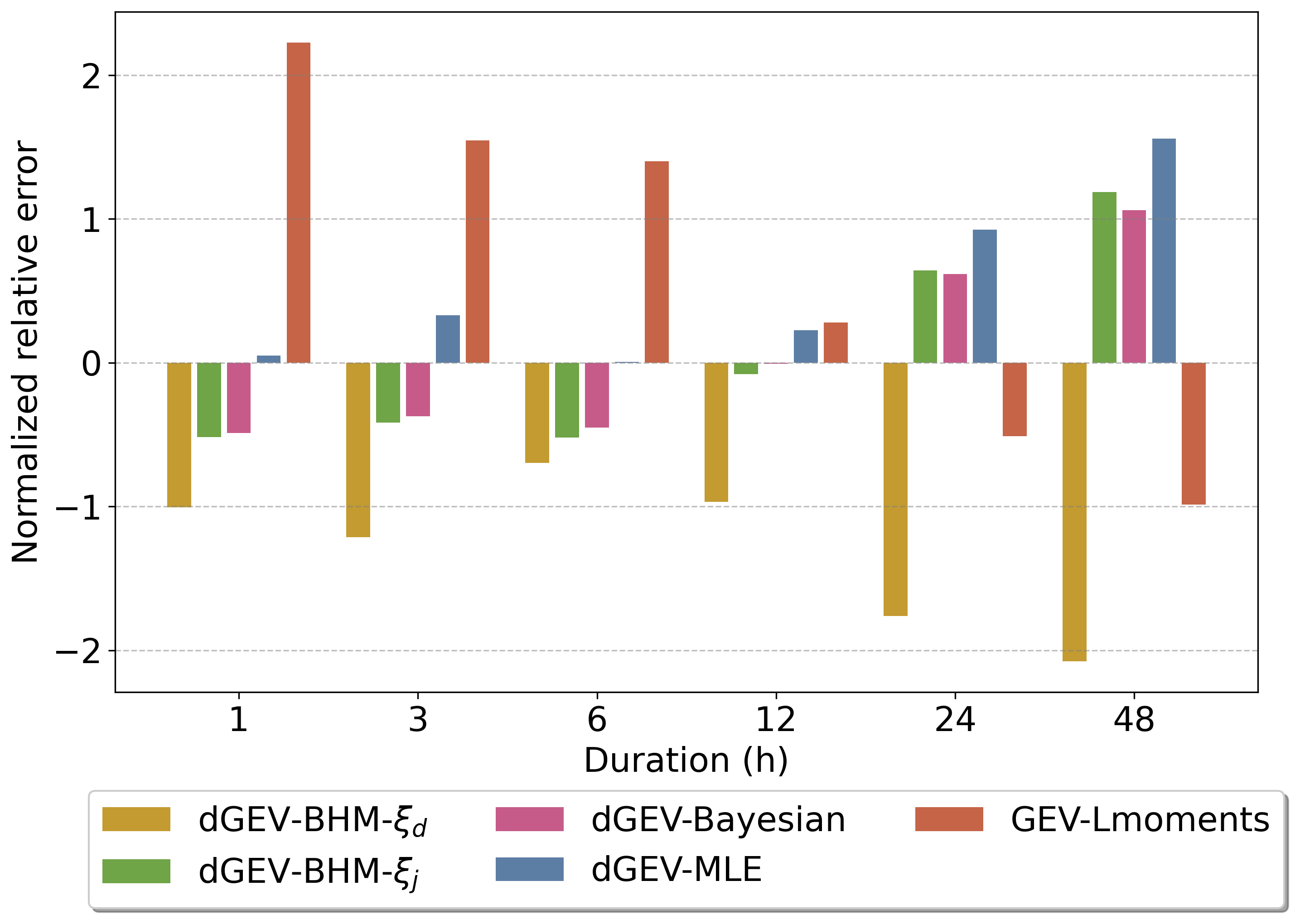 In Fig. 8 we present the location average 100-year RE for sub-sample size n=30 at different durations. We normalize the RE for each model across five models for each duration. We intentionally leave the dGEV-BHM-ξj,d out, as the results of RE are so high that they distort the standardized results. Across all durations, the dGEV-BHM-ξd consistently shows the lowest RE. GEV-Lmoments shows high errors for the short durations of 6 h and below, but comparably low REs for 24 and 48 h. In contrast, dGEV-BHM-ξj, dGEV-Bayesian, and dGEV-MLE show the tendency to perform better for shorter than for longer durations.