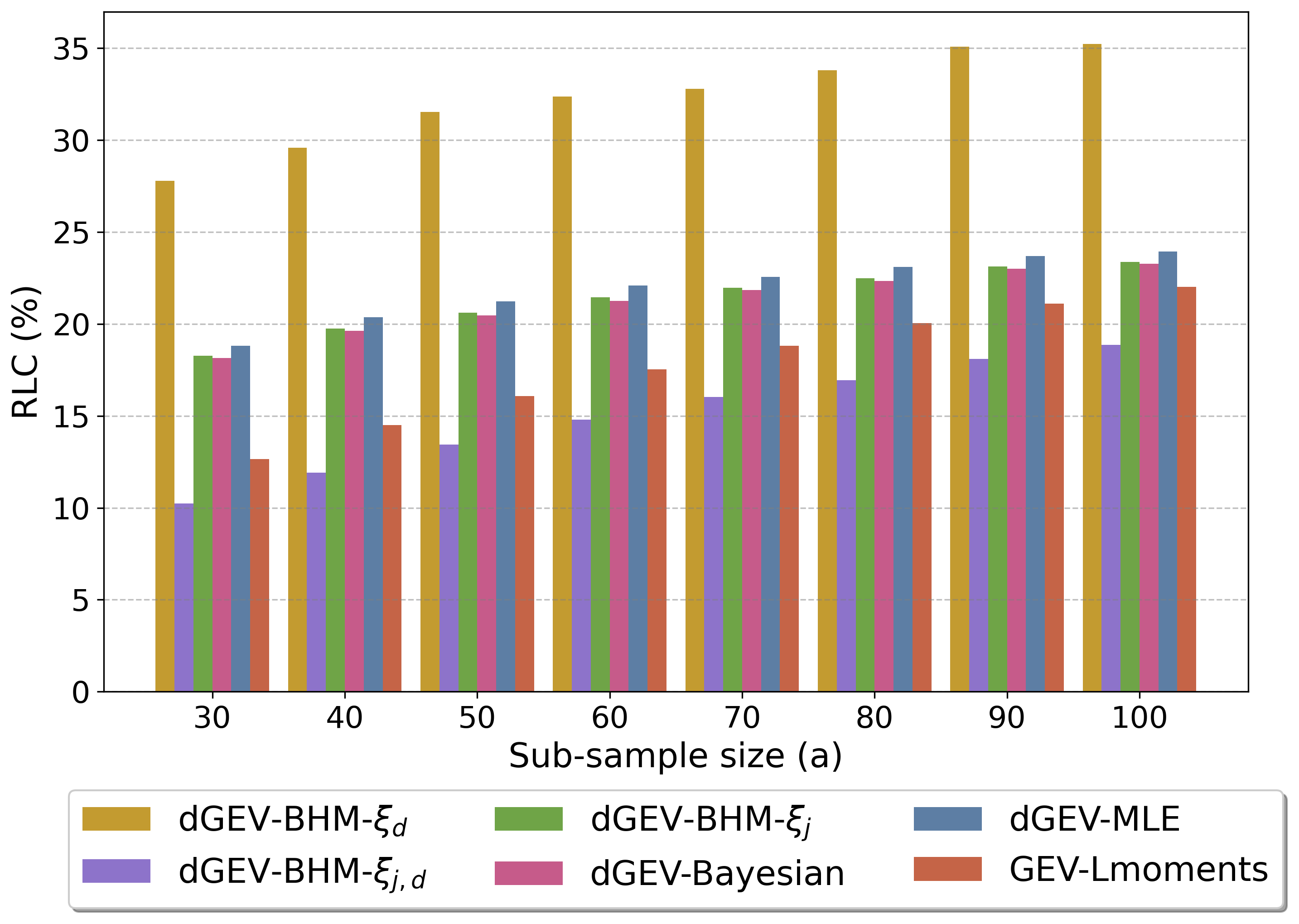 Figure 9 features the RLC for the 100-year return level. For all six EVT models, the RLC increases with increasing sample size. The dGEV-BHM-ξd can achieve the highest RLC between 27 % and 35 % outperforming the other five EVT models by around 10 %, proving its robustness. The dGEV-BHM-ξj, dGEV-Bayesian, and dGEV-MLE perform similarly in a range from 17 % to 24 %. In contrast, both the dGEV-BHM-ξj,d and GEV-Lmoments consistently exhibit the lowest RLC between 10 % and 22 %.