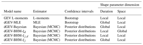 Table 1Table of all six EVT models and their estimation method, generation of the confidence intervals and shape parameter dimension (space and/or duration). Shape parameter dimensions: Global = one shape parameter spanning across the dimension indices. Local = several shape parameters across dimension indices.