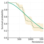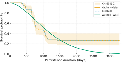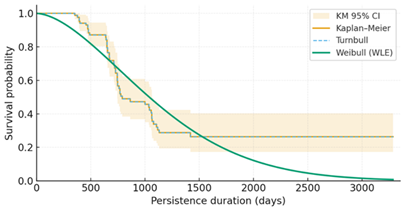 To assess distributional adequacy, lognormal and gamma models were fitted under the same right-censored likelihood structure used for the Weibull model. In all cases, episodes that are doubly censored in calendar time were represented as right-censored persistence times with , ensuring direct comparability of likelihood-based criteria across distributions. Table 3 reports log-likelihoods and information criteria. The lognormal model attains the smallest AIC and BIC values, followed by the gamma distribution, while the Weibull MLE performs slightly worse under these criteria. The WLE version yields somewhat larger AIC/BIC values due to the effective reduction in influence from downweighted observations, though overall model fit remains comparable. Although the lognormal distribution achieves the smallest information criteria, estimated median persistence times and upper-tail quantiles are broadly comparable across the three models (Table 3). We retain the Weibull family as the primary model because it provides a direct monotone hazard interpretation and integrates naturally with the robust weighted-likelihood framework under right-censoring. The estimated shape parameter consistently exceeds one (Table 2), indicating an increasing recovery hazard over time – a pattern that aligns with ecological expectations of post-fire regrowth. Given the similarity of central and upper-tail persistence estimates across all candidate distributions, the choice of the Weibull model is guided by interpretability and robustness rather than marginal differences in information criteria. Nonparametric survival curves (Kaplan–Meier and Turnbull) were compared with the fitted WLE–Weibull survival curve (Fig. 2). The robust Weibull curve closely follows both empirical estimators over the central duration range of approximately 500–1500 d, with only modest deviations in the tails where data are sparse.