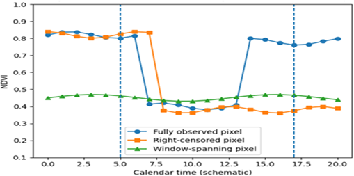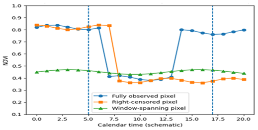 Figure 1Example NDVI trajectories illustrating calendar-time censoring patterns. The vertical dashed lines mark the opening (A) and closing (B) dates of the satellite analysis window. Fully observed pixels recover within the window, right-censored pixels remain degraded beyond B, and doubly censored pixels are degraded throughout the entire observation window.