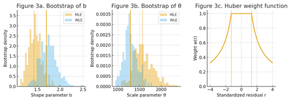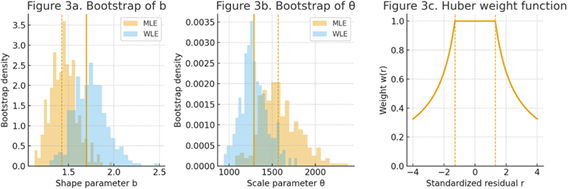 Figure 3Bootstrap diagnostics and weighting function for the Weibull model: (a) bootstrap densities of the shape parameter b under MLE and WLE; (b) bootstrap densities of the scale parameter θ; (c) Huber weight function with cutoff at .