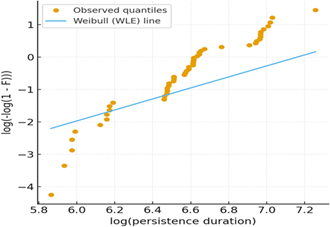 A Weibull probability plot for uncensored episodes is shown in Fig. 4. The empirical points display approximate linearity over the central quantile range, consistent with the Weibull specification. Departures are more visible in the lower and upper tails, where the number of uncensored observations is small and censoring is relatively heavy. Such deviations are consistent with finite-sample variability under tail sparsity and do not materially affect inference for the central portion of the persistence distribution, which drives the primary ecological interpretation. Taken together, Figs. 3 and 4 support the use of the WLE: it enhances numerical stability and mitigates the influence of extreme observations while preserving the primary structure of the persistence-time distribution.