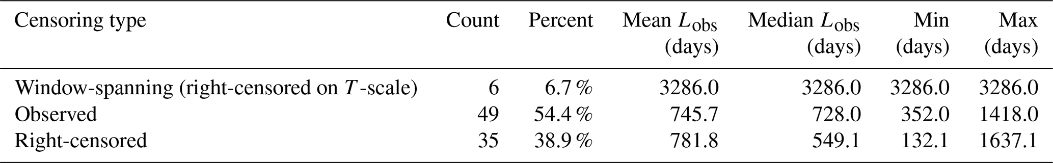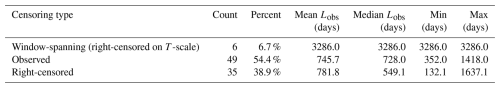Table 1 summarizes the observed and censored burn-scar episodes in the MTBS sample (n=90). In the MTBS sample, 49 episodes (54 %) are fully observed and 35 (39 %) are right-censored on the persistence-time scale. An additional 6 episodes (7 %) remain degraded throughout the analysis window. These latter cases are doubly censored in calendar time but contribute as right-censored observations on the persistence-time scale. Nearly half of all episodes are therefore incomplete, underscoring the need for an explicit censored-lifetime formulation rather than relying on raw observed durations.