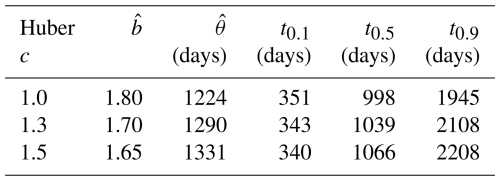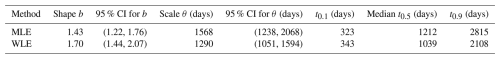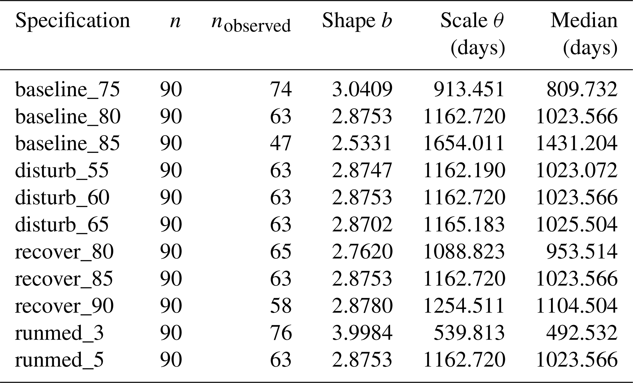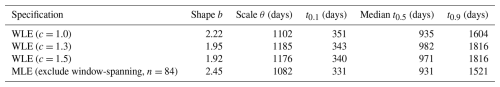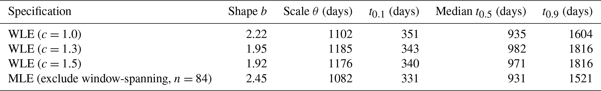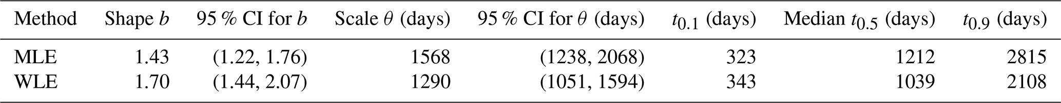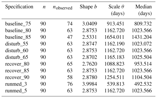 Fitting the Weibull model to the 90 MTBS episodes yields stable parameter estimates under both maximum likelihood (MLE) and weighted likelihood (WLE). Table 2 summarizes numerical results with bootstrap confidence intervals. Under both methods, the Weibull shape parameter exceeds one, indicating an increasing recovery hazard: the longer a scar persists, the more likely it is to recover in subsequent months. The scale parameter corresponds to persistence times on the order of two to three years, consistent with typical recovery trajectories in boreal and sub-arctic ecosystems (White et al., 2022; Smith-Tripp et al., 2024). The WLE primarily reduces sampling variability driven by a small number of very long-lived scars, including the window-spanning episodes discussed in Sect. 3, while leaving the overall recovery timescale essentially unchanged. The robust estimator produces slightly more stable estimates of the median and upper quantiles but preserves the central tendency. Overall, the Weibull model provides a compact and interpretable summary of the persistence distribution.