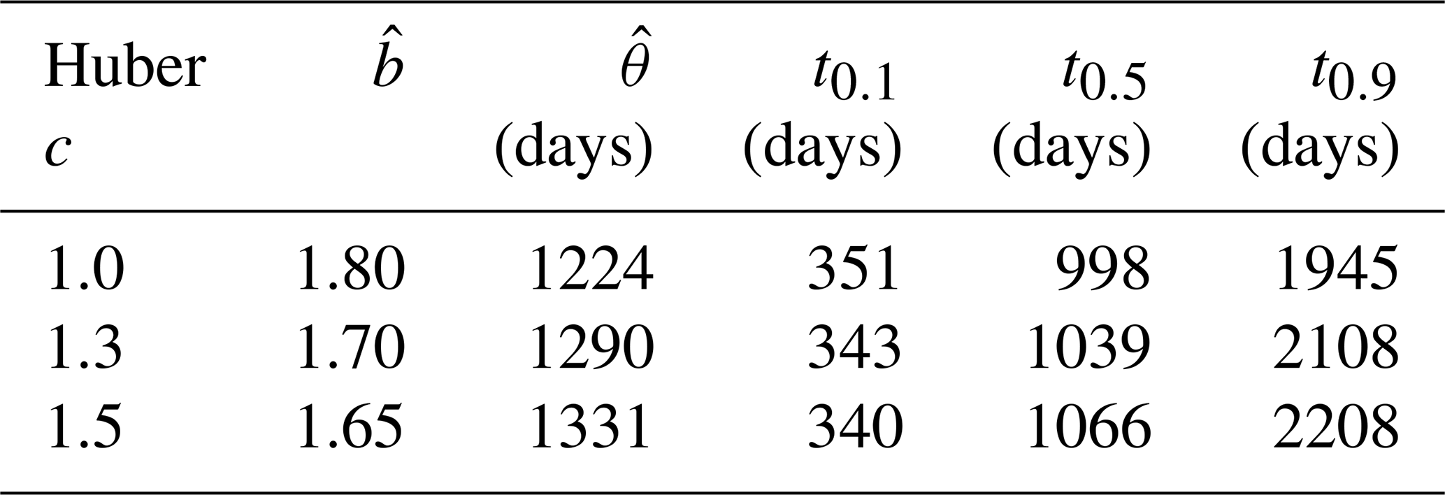Robustness was examined using the bootstrap procedure described in Sect. 4.4. The bootstrap densities for the shape and scale parameters (Fig. 3a–b) exhibit narrower dispersion under the WLE than under the MLE, indicating that the robust procedure reduces variability driven by a small number of long-lived scars. Importantly, the central locations of the bootstrap distributions remain very similar under both estimators, suggesting that the WLE stabilizes inference without materially altering the central tendency. Figure 3c displays the Huber weight function at the selected tuning constant (). Episodes with receive full weight, while more discordant observations are progressively downweighted. Only a small fraction fall into the strongly downweighted region, indicating that most pixels exhibit broadly consistent recovery dynamics and that the robustness gains arise primarily from moderating a limited set of extreme cases.