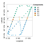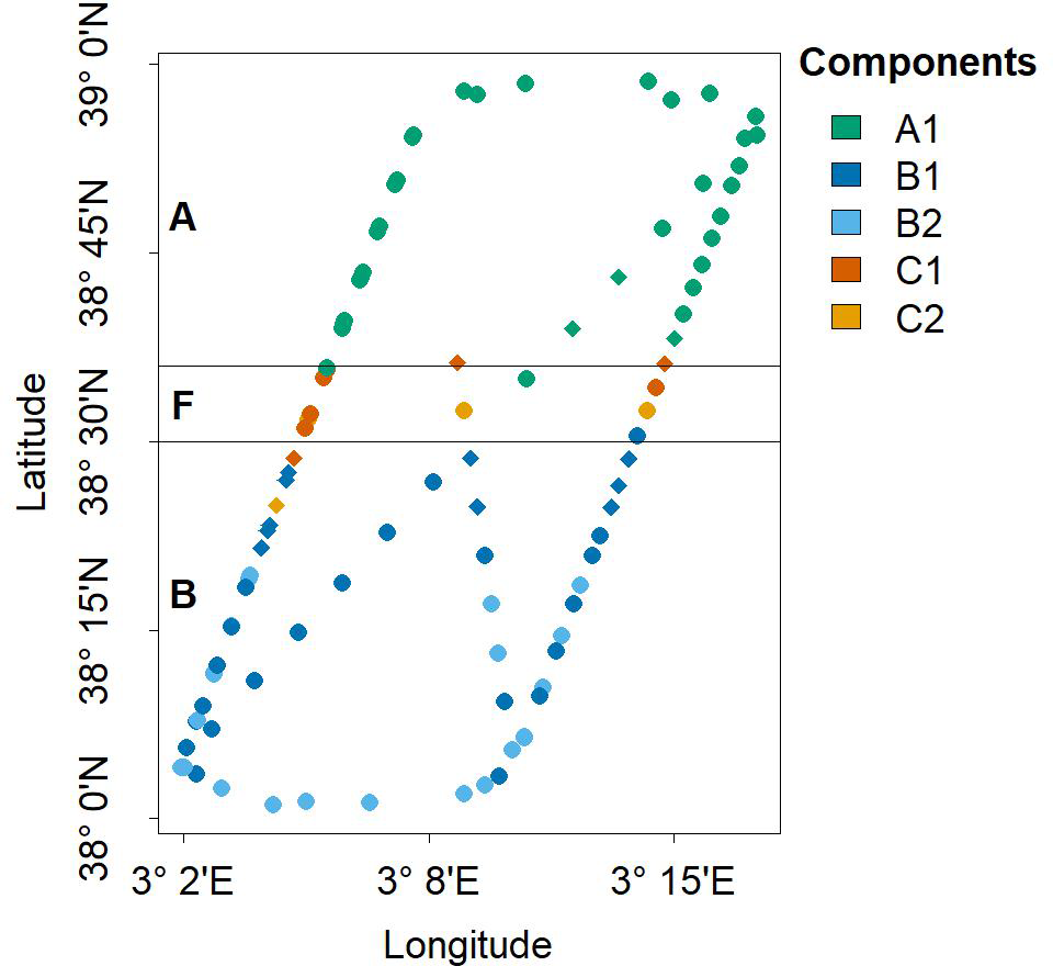 Figure 8Spatial distribution of dominant components within the NS-Hippodrome. Dots are colored according to the multivariate Gaussian component, i.e. sub-communities (A1, B1, B2, C1 and C2) that reach the highest density (in nine dimension) for the sample phytoplankton groups observed biomass. The horizontal black lines correspond to the frontal area (latitude between 38.5 and 38.6°N, as in Fig. 1c, Component A1 (A community) was mostly dominant in the North of the Hippodrome. Components B1 and B2 (B sub-communities) were mostly dominant in the south of the Hippodrome. Components C1 and C2 (unknown C sub-communities) are mostly dominant in the front. Note that diamond shaped points correspond to samples transitional waters, T, that were not taken into account during the characterisation of the phytoplankton nine communities.