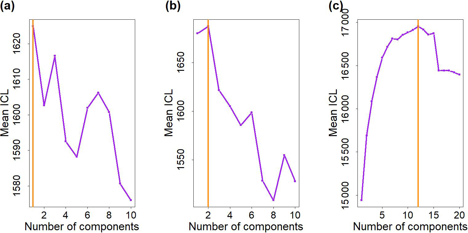 Figure 2Values of the mean Integrated Complete-data Likelihood (ICL) in function of the number of multivariate Gaussian components. (a) Water mass A (to model ComA). (b) Water mass B (to model ComB). (c) Outside dataset (to propose likely parameters to model ComC). The vertical orange lines correspond to the number of multivariate Gaussian components that reach the highest ICL values.