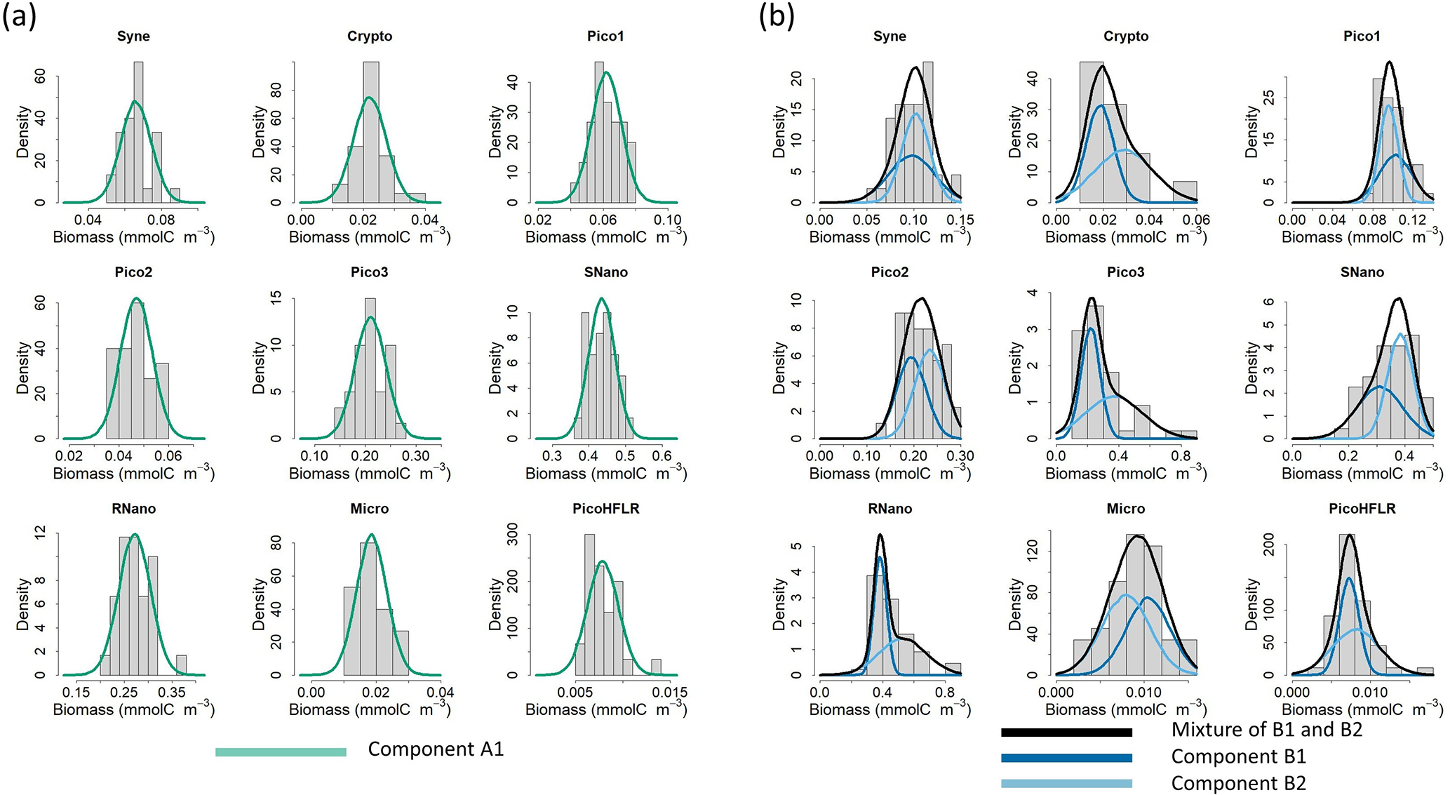 Figure 3Fit of the multivariate Gaussian component with the observed biomass for each phytoplankton group in (a) water mass A and (b) water mass B. Histograms show the observed phytoplankton biomass distributions, and lines correspond to the density curves of the multivariate Gaussian components estimated by EM. Note that in (b) two components are necessary to model ComB; the components B1 and B2 are weighted by their α values and the black line corresponds to the finite mixture (i.e. here the sum) of these two components.