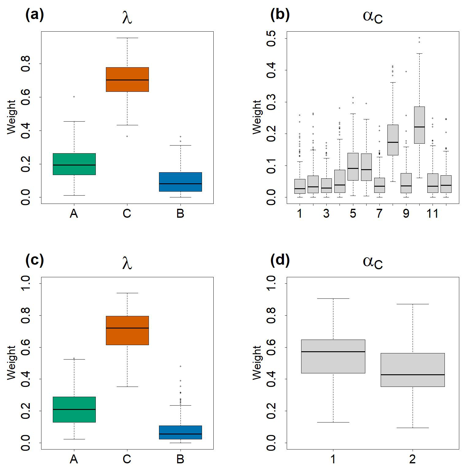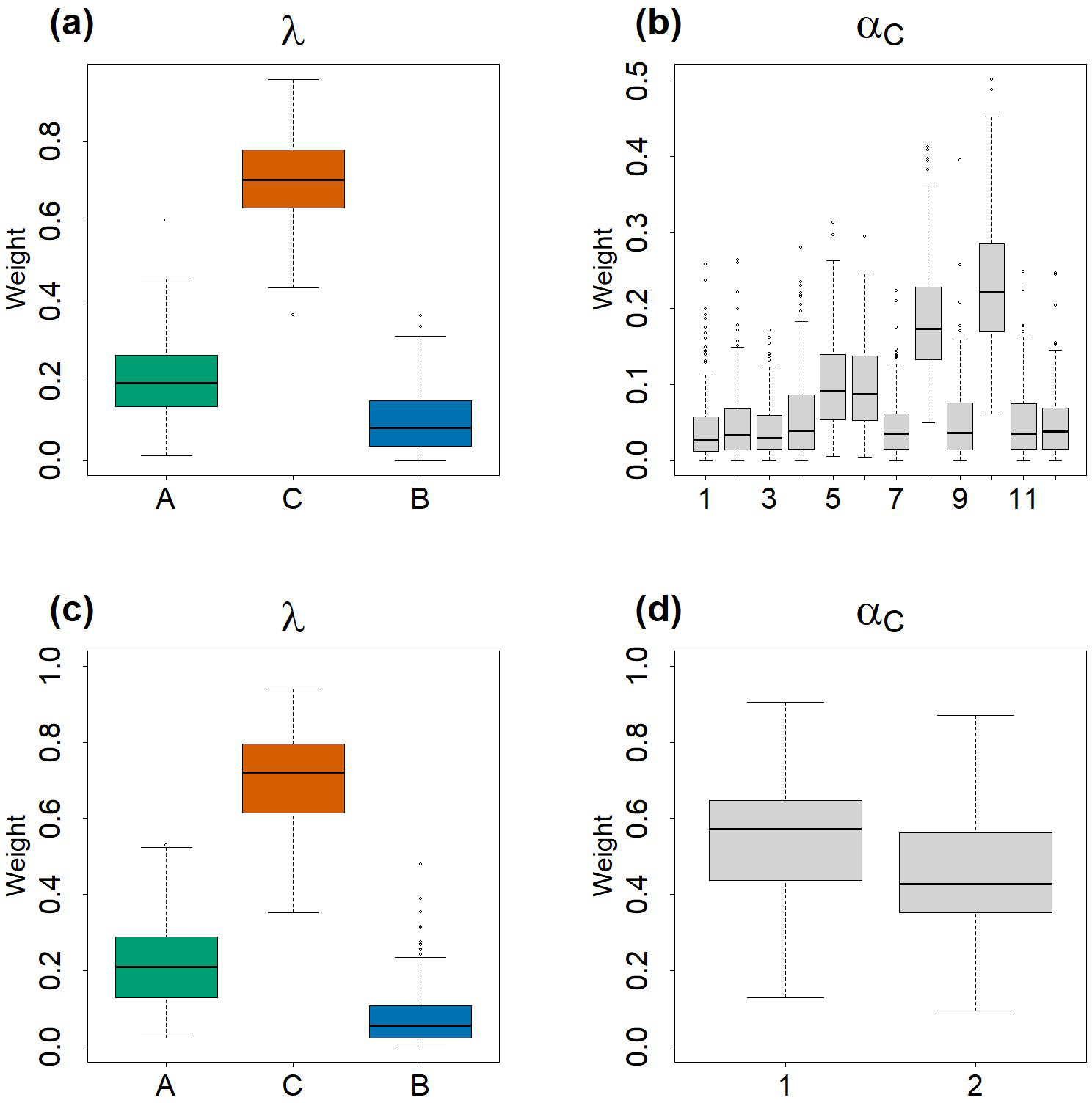 Figure 4Boxplots of the estimated values of αC and λ values by the Bayesian models. In total 100 values were used to construct the boxplots. Each 40 values among the 4000 iterations of the posterior distributions, generated by the HMC chains, were taken in order to avoid autocorrelation within the chains. (a) and (b) represent, respectively λA,λB and λC and αC1,,C12 of exploratory model. (c) and (d) represent, respectively λA,λB and λC and αC1,C2 of the final model.