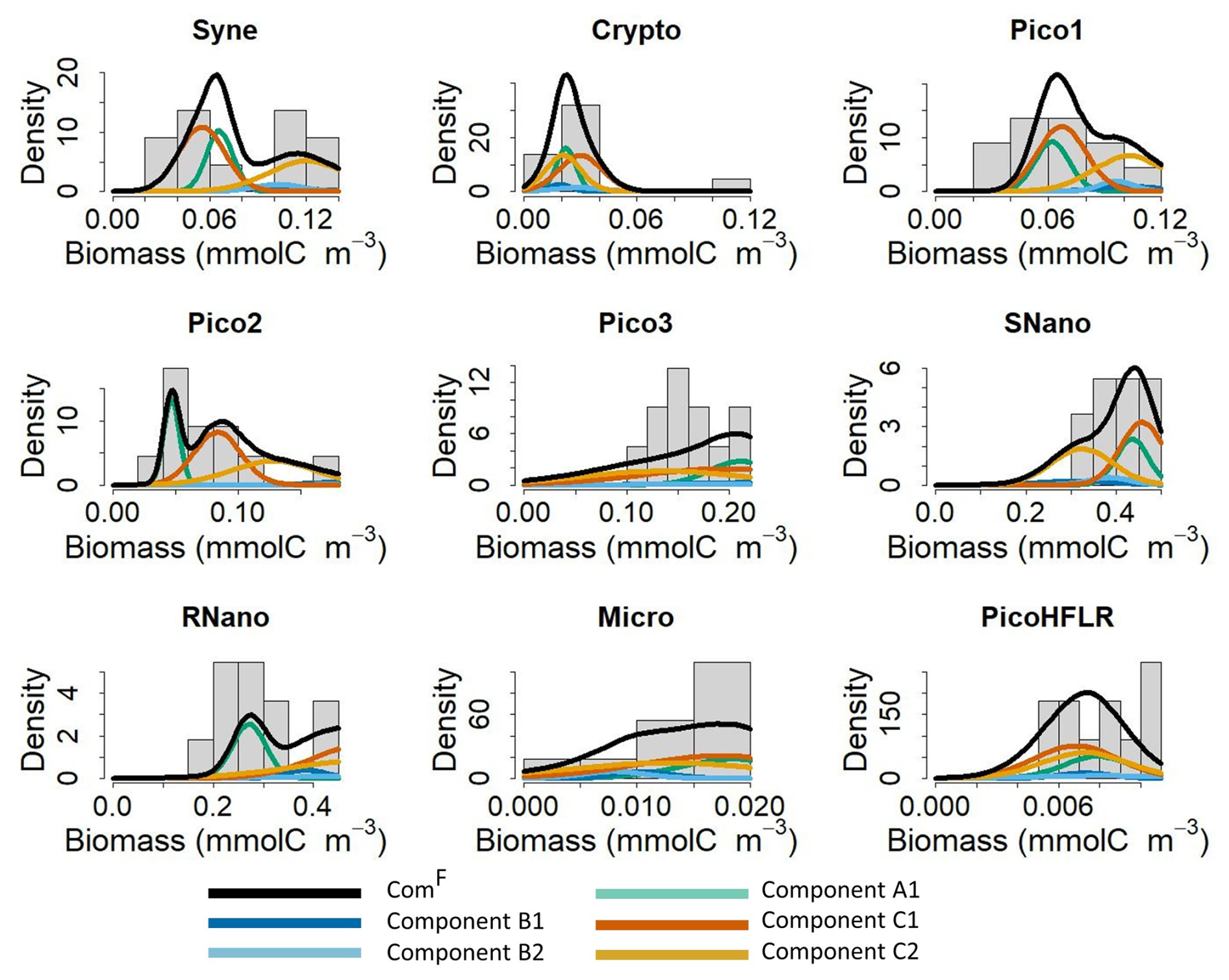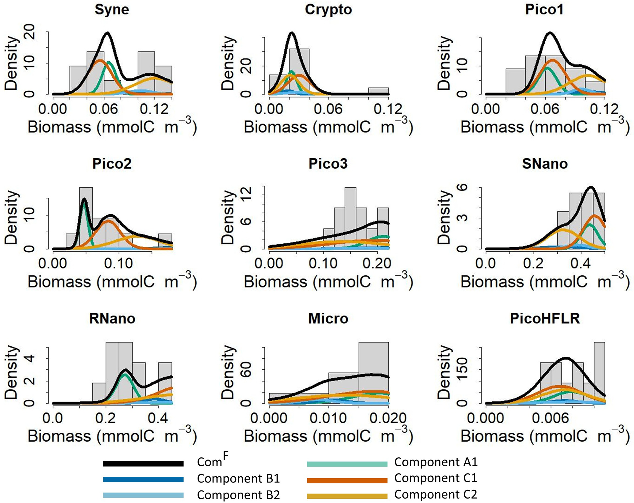 Figure 5 shows how the final model fits the observed data in the front. As expected when looking at the weight λB (0.06, see in Fig. 4c), components B1 (dark blue curve) and B2 (light blue curve) contribute little to the global mixture (black lines), which is mostly driven by components A1 (light green curve), C1 (dark orange curve), and C2 (orange curve). Overall, the mixture of these five components captures the phytoplankton groups biomass distribution well. In some cases, the biomass distribution is bimodal (for Syne, Pico2, RNano) or skewed (for Pico1, Micro). For Pico3 and RNano a difference remained between the estimated density and the observed biomass in the front (Fig. 5). For Pico3, the μ values for C1 and C2 are the lowest (see Table 2). However due to high variance in Σ matrices the mode around 0.14–0.16 is not captured by the model.