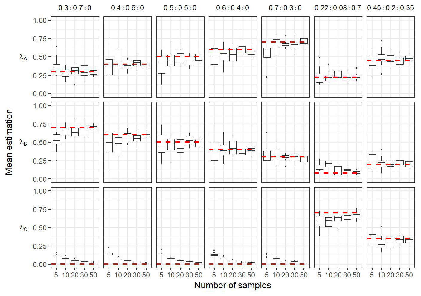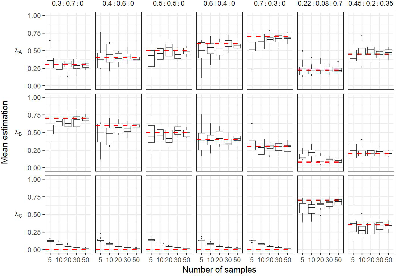 Figure 7Boxplots of the mean of the posterior distributions during the sensitivity analysis. Each column correspond to the λA:λB:λC estimation of a same condition: In the case frontal community is composed only by a mixture of adjacent water masses (i.e. λC=0) with varying proportion of simulated λA:λB:λC (i.e. 0.3:0.7:0; 0.4:0.6:0; 0.5:0.5:0; 0.6:0.4:0; 0.7:0.3:0). The two last columns correspond to simulations where frontal community includes a new community ComC (λC≠0), here the proportion used for simulations are the same as observed in the in situ dataset (i.e. λA=0.22, λB=0.08, λC=0.7) and 0.45:0.2:0.35. The dashed red horizontal lines correspond to the true λ values used to simulate the data in the mixtures. In each conditions the number of observations in the simulated data in the front varies from 5 to 50. Each boxplot is based on the 10 values of the mean calculated on the 10 simulated datasets for a same hypothesis and a same number of observations.