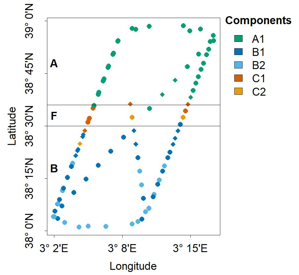 Figure 8 shows the spatial projection of each sample point, with shapes and colors representing their community and sub-community classification, identified as the dominant component and sub-component of the Gaussian mixtures (highest λ and α). We reach two key conclusions. First, our approach successfully reconstructed the initial pattern observed by Tzortzis et al. (2021), characterized by a distribution of two communities on either side of the frontal region (here identified as ComA and ComB). A notable refinement was the identification of two sub-communities within ComB (B1 and B2), which could be attributed to significant fine-scale meandering activity in the southern part of the front (i.e., within the Algerian Basin) (Millot1999). We hypothesize that such dynamics could lead to a closer cohabitation of different sub-communities. Second, our approach appeared to successfully detect the presence of the unknown ComC located within the frontal community (ComF).