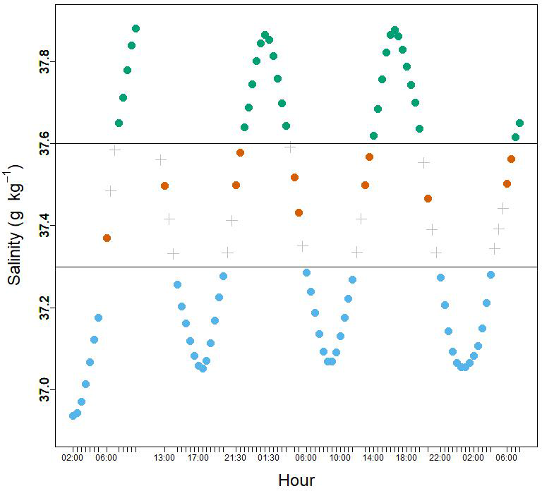 Figure A1Variation of the salinity measurements during the cruise between 11 and 13 May. The horizontal lines correspond to the isohalines that were chosen to characterize the frontal area. Green dots correspond to the water mass A, blue dots to the water mass B. Within the frontal area, latitudinal limits were chosen according to Tzortzis et al. (2021). In this zone, orange dots correspond to the front, and grey crosses to the transitional waters, T, that are not taken for the data analyses.