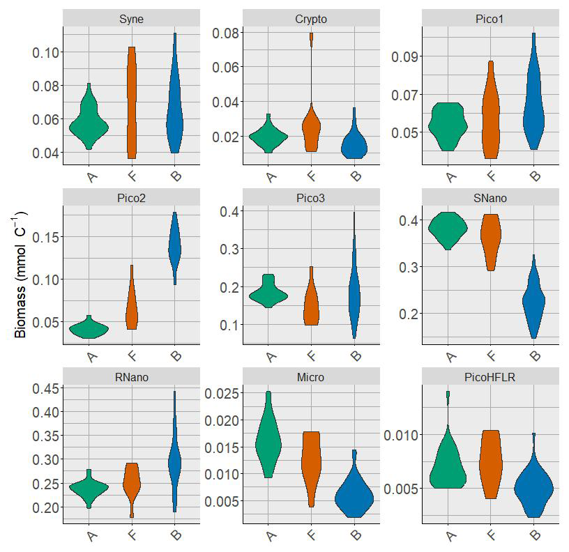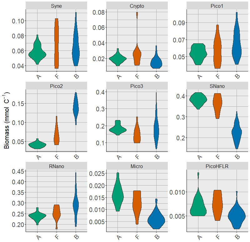 Figure A2Violin plot of the phytoplankton groups biomass in the three water masses A, F and B. Biomasses are expressed in mmolC m−3.