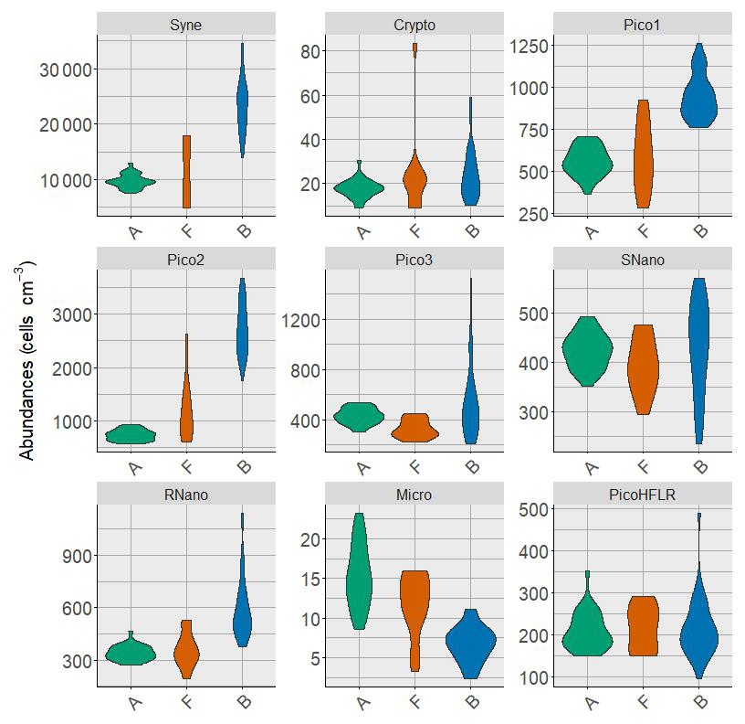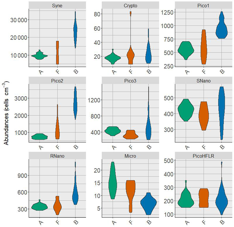 Figure A3Violin plot of the phytoplankton groups abundances in the three water masses A, F and B. Abundances are expressed in cells cm−3.