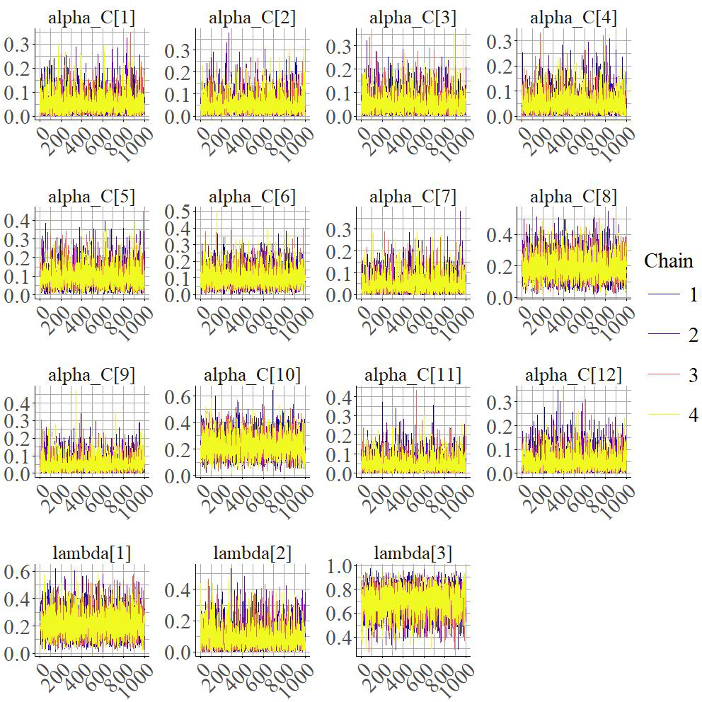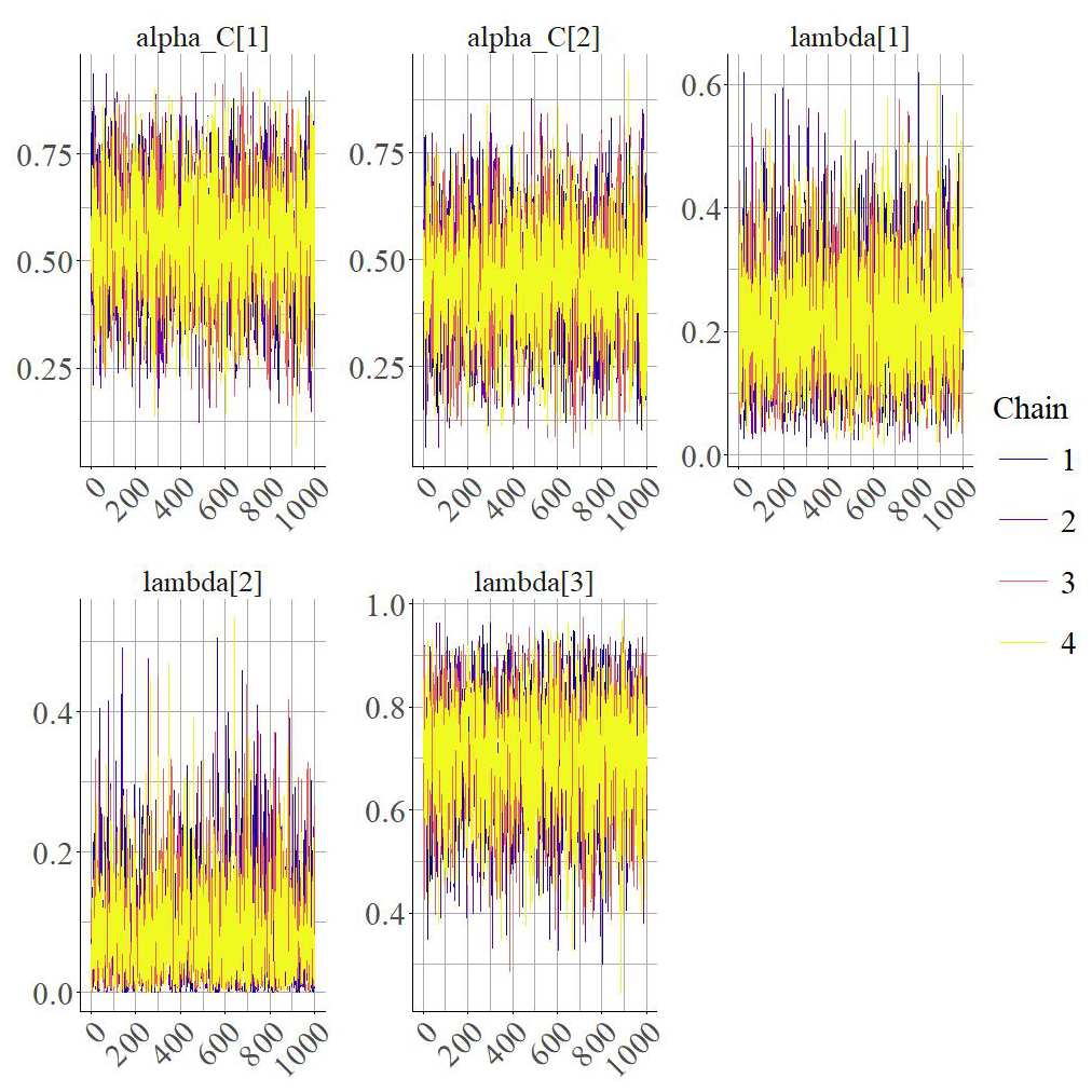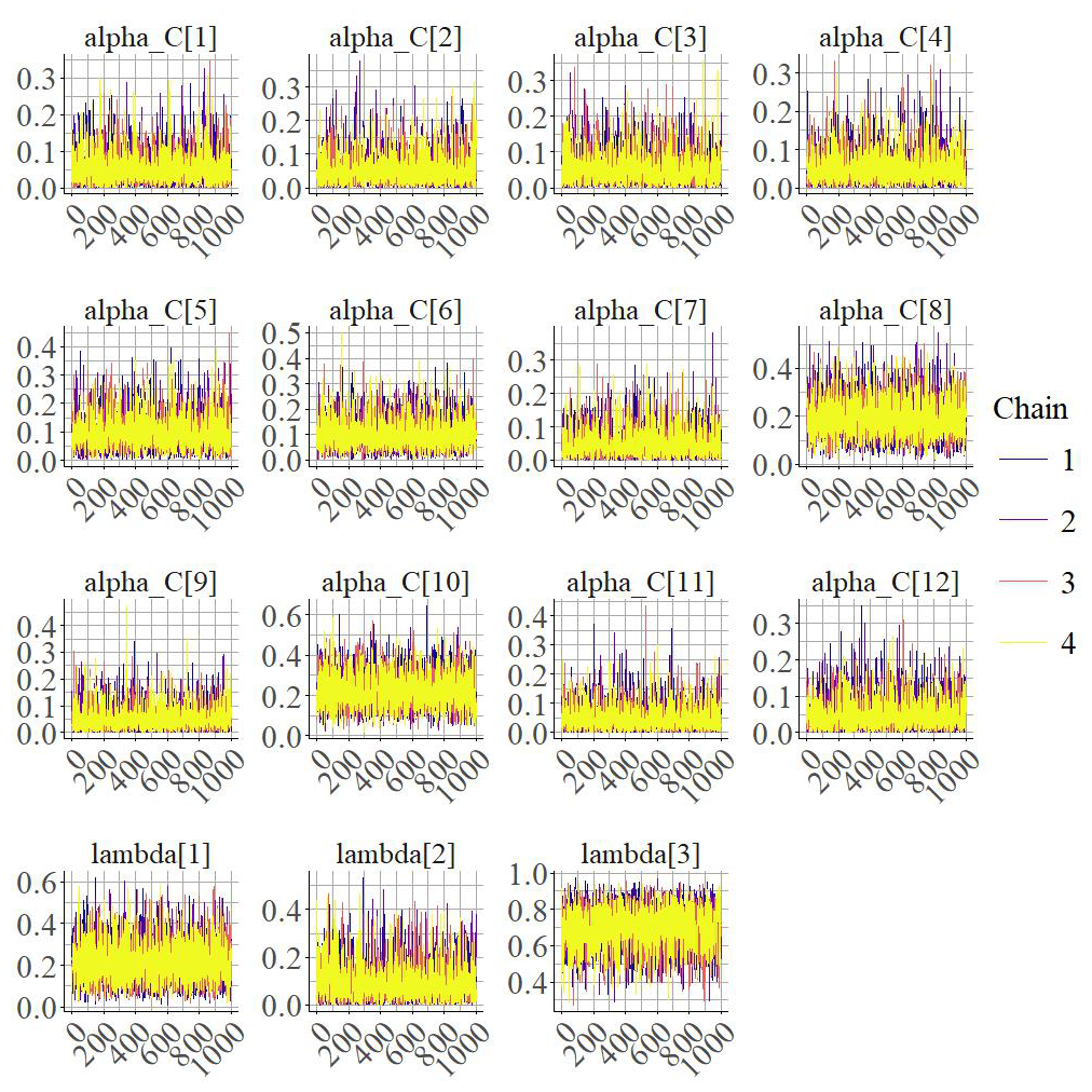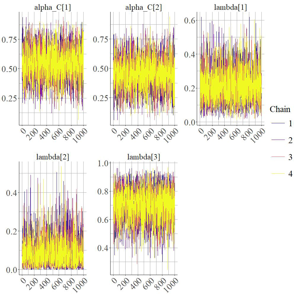 Figure A5Trace of the posteriors distributions of the parameters estimated by the second Bayesian model, final model.