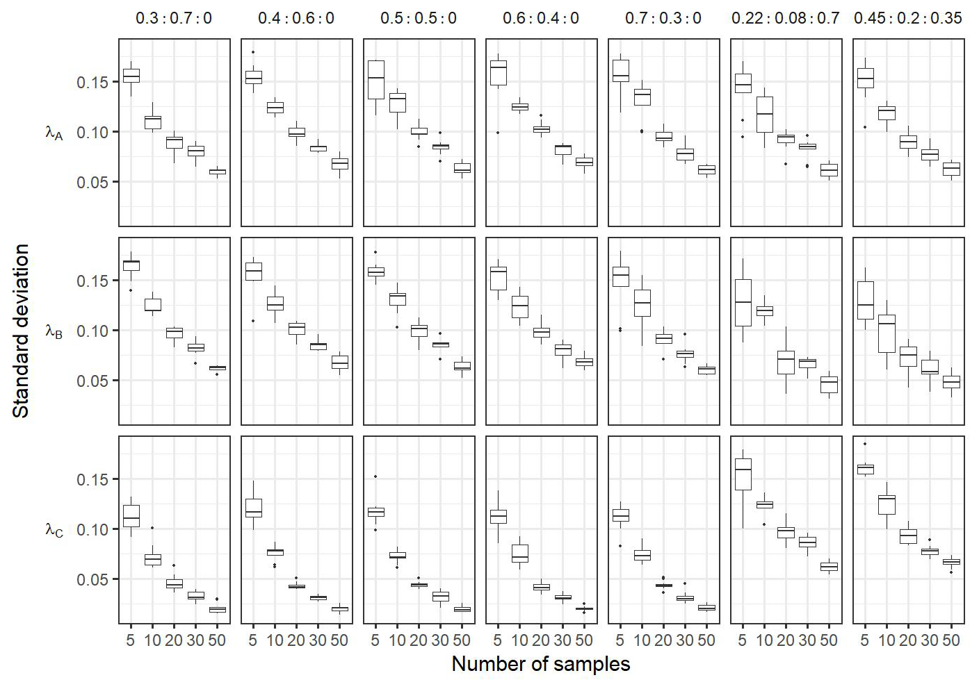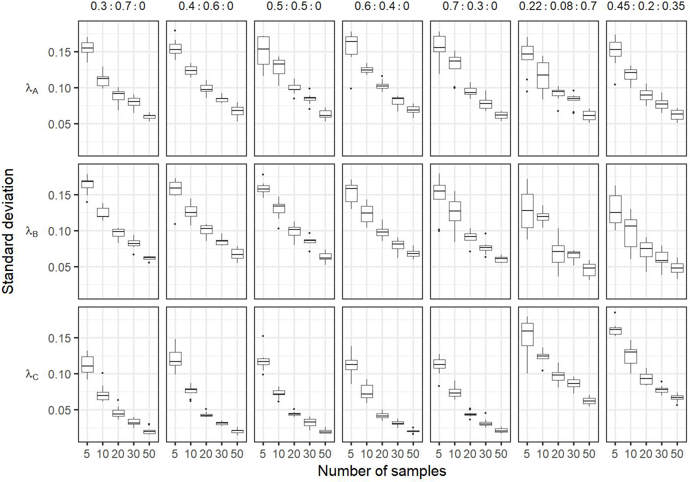 Figure A6Boxplots of the standard deviation of the posterior distributions of the sensitivity analysis. Each column correspond to the λA:λB:λC estimation of a same condition: In the case frontal community is composed only by a mixture of adjacent water masses (i.e. λC=0) with varying proportion of simulated λA:λB:λC (i.e. 0.3:0.7:0; 0.4:0.6:0; 0.5:0.5:0; 0.6:0.4:0; 0.7:0.3:0). The two last columns correspond to simulations where frontal community includes a new community ComC (λC≠0), here the proportion used for simulations are the same as observed in the in situ dataset (i.e. λA=0.22, λB=0.08, λC=0.7) and 0.45:0.2:0.35. The dashed red horizontal lines correspond to the true λ values used to simulate the data in the mixtures. In each conditions the number of observations in the simulated data in the front varies from 5 to 50. Each boxplot is based on the 10 values of the mean calculated on the 10 simulated datasets for a same hypothesis and a same number of observations.
