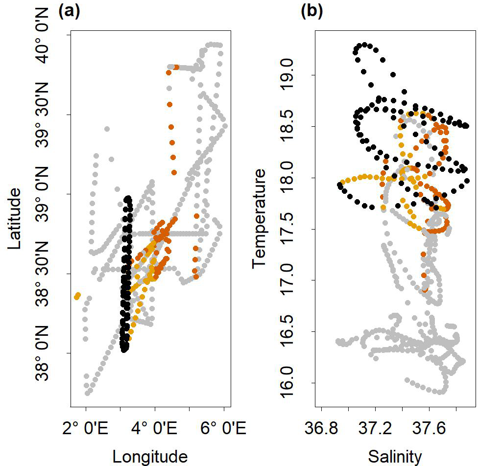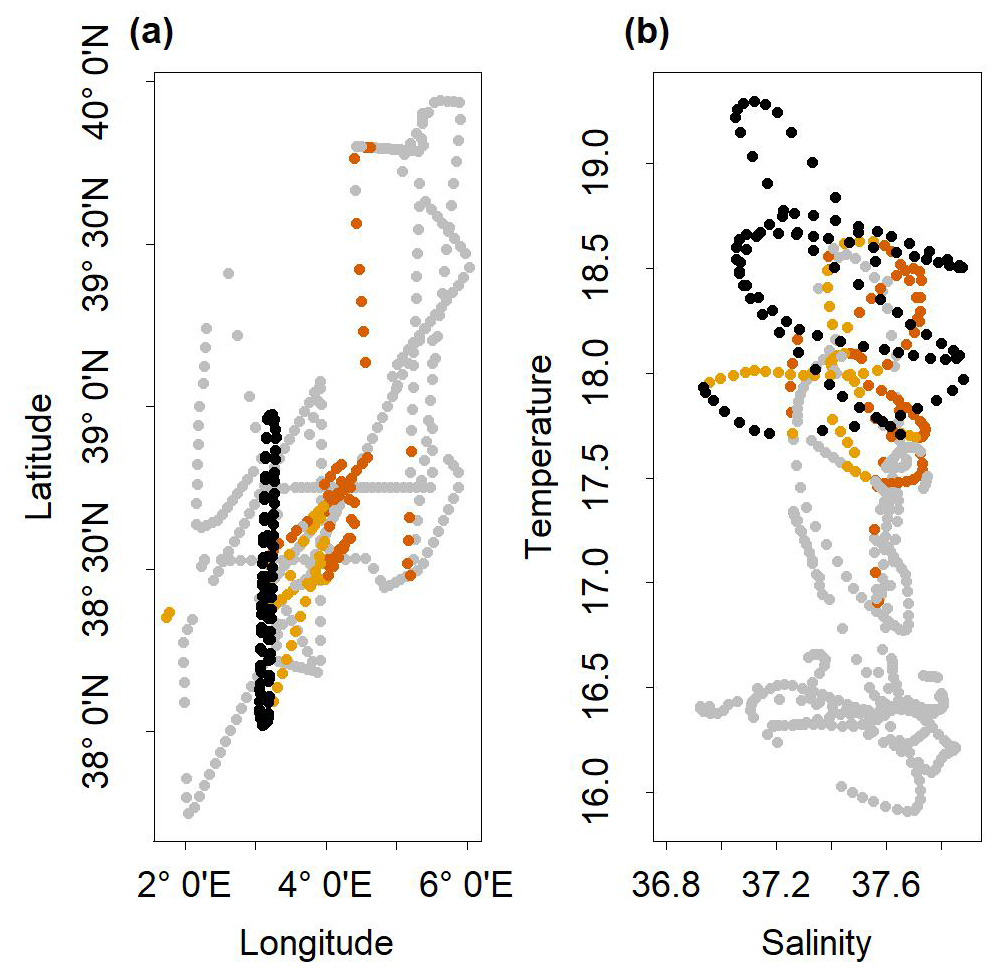 The strong assumption that the potential front-adapted community existed within the outside dataset implies two limitations. On the one hand, the outside dataset is not an exhaustive dataset of the region. Actually, phytoplankton communities of the southern water masses may not be efficiently represented in the outside dataset, since the water masses off the Algerian coast (south of the sampling area) were not sampled. In addition, the inclusion of the stations close to the Balearic coasts might have led to an over-representation of coastal phytoplankton communities (different than the one observed in the open sea). But excluding coastal stations and selecting only data near the NS-Hippodrome transect (e.g., between 38–39° N and 3–5° E) did not drastically affect our results. On the other hand, frontal conditions could be unique in both space and time and might have not been sampled elsewhere than in the NS-Hippodrome transect. Actually, the communities identified in ComC, C1 and C2, were mostly observed in stations in the same range of temperature and salinity that were close to the studied front, to the east, and were sampled a few days before the NS-Hippodrome transect sampling (Fig. A7). Hydrodynamic circulation across the frontal area was eastward (Tzortzis et al.2021). This suggests that the communities observed at these sites in the outside dataset may have been advected from the front.
