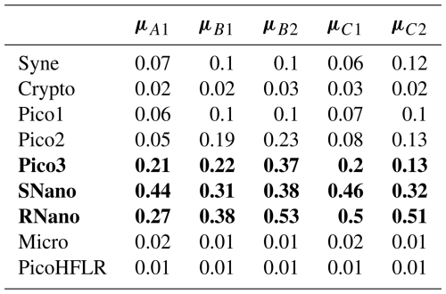 Table 2Rounded μ (mmol C m−3) values estimated by Expectation–Maximization algorithm for the components in ComA (A1), ComB (B1 and B2) and ComC (C1 and C2). The rows in bold correspond to the three phytoplankton groups presenting the highest μ values (i.e. biomass) within a component. For a better comparison between components for the same phytoplankton groups see Fig. 6.