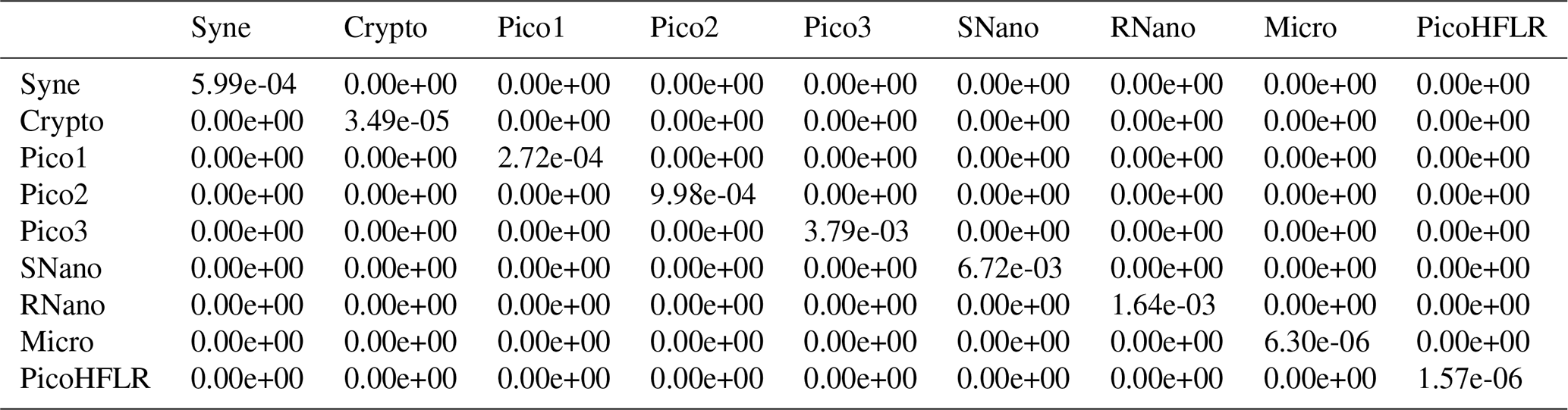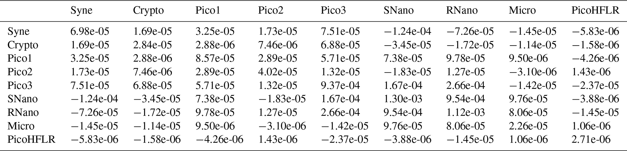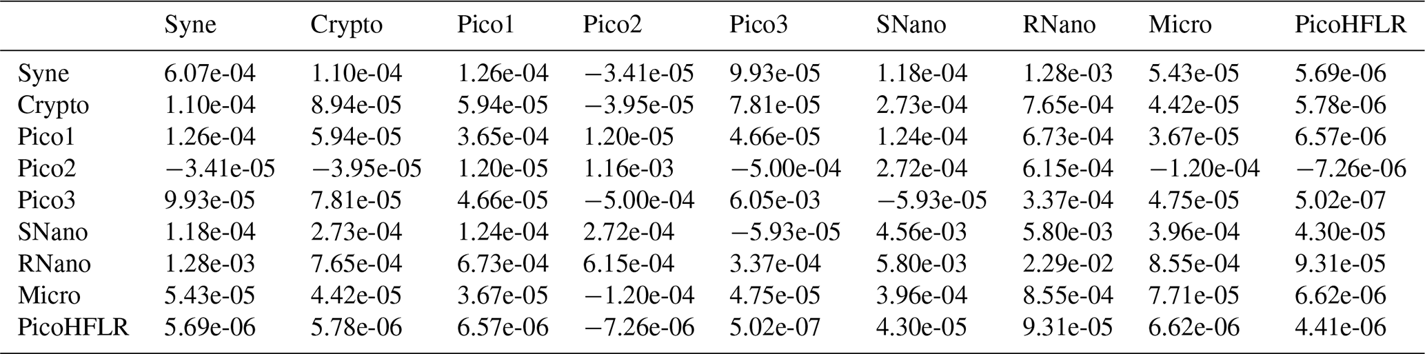 The parameters of the multivariate Gaussian estimated by the EM algorithm are referenced in Table 2 for μ parameters and in Tables A3A7 for Σ covariance matrices. The μ values and the variances in the diagonal of the Σ matrices of SNano, RNano and Pico3 are the highest. These results highlight the dominance and a large variability in biomass of these phytoplankton groups during the cruise.