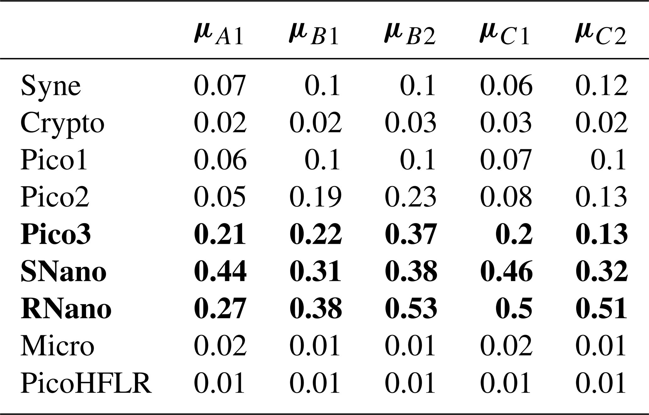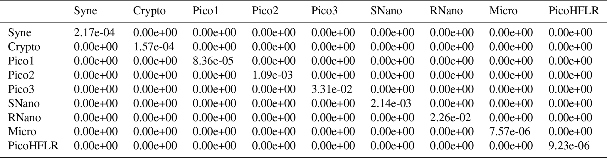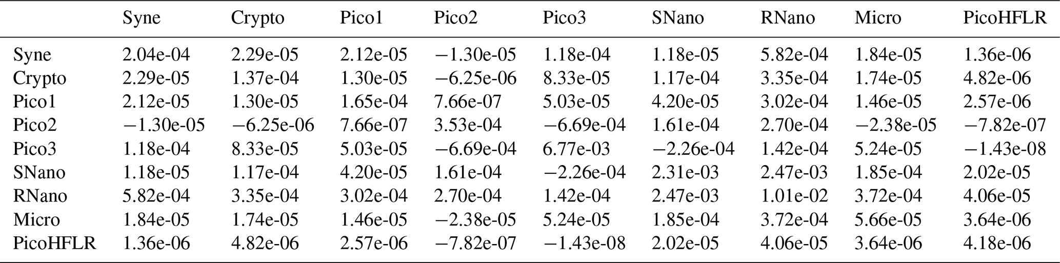 The parameters of the multivariate Gaussian estimated by the EM algorithm are referenced in Table 2 for μ parameters and in Tables A3A7 for Σ covariance matrices. The μ values and the variances in the diagonal of the Σ matrices of SNano, RNano and Pico3 are the highest. These results highlight the dominance and a large variability in biomass of these phytoplankton groups during the cruise.