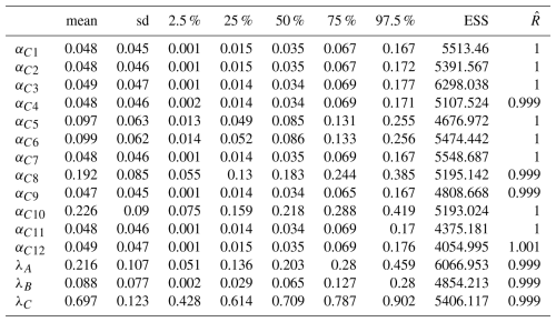 Table A1Summary of the statistics (mean, standard deviations, quantiles 2.5, 25, 50, 75 and 97.5 % of the posterior distributions) and convergence metrics (effective sample size ESS, and R^) of the estimated parameters of the explanatory model.