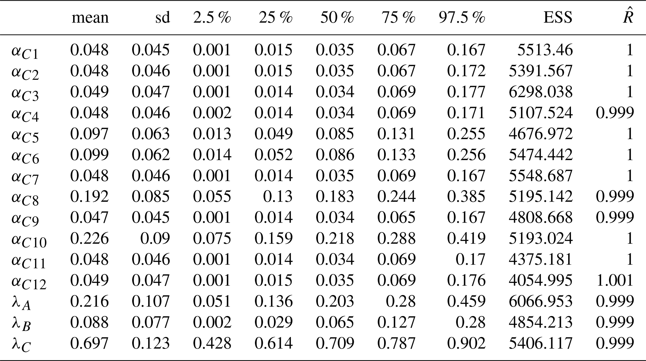 In the final model (that converged, see Fig. A5 for the trajectories, and Table A2 for convergence metrics), the estimations of λA,λB and λC did not vary drastically – 0.203 (quantile 2.5 % = 0.057, quantile 97.5 % = 0.467) for ComA, 0.06 (quantile 2.5 % = 0.003, quantile 97.5 % = 0.281) for ComB and 0.714 (quantile 2.5 % = 0.439, quantile 97.5 % = 0.901) for ComC, Fig. 4c – relative to those observed before in the model with 12 components. In this second model, the weights of C1 (αC1=0.55, quantile 2.5 % = 0.258, quantile 97.5 % = 0.823) and C2 (αC2=0.45, quantile 2.5 % = 0.177, quantile 97.5 % = 0.742) were almost equivalent in the mixture (Fig. 4d and Table A2).
