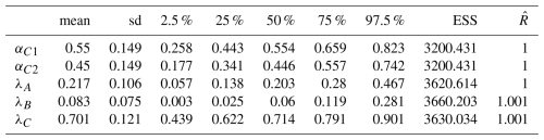 Table A2Summary of the statistics (mean, standard deviations, quantiles 2.5, 25, 50, 75 and 97.5 % of the posterior distributions) and convergence metrics (effective sample size ESS, and R^) of the estimated parameters of the final model.