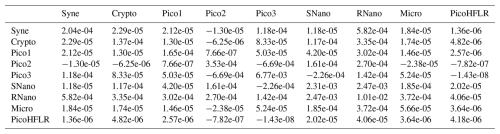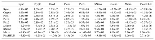 Nine phytoplankton groups were identified (Tzortzis et al.2021): one cyanobacterial group, Synechococcus (Syne, 1,µm); four picoeukaryote groups (Pico1, Pico2, Pico3, PicoHFLR, 0.2–2 µm); two nanoplankton groups (SNano, RNano, 2–20 µm), cryptophytes (Crypto, 10–50 µm); and one microphytoplankton group (Micro, 20–200 µm). Abundances (number of cells) are converted into carbon biomass (mmolC m−3) using allometric relationships described in Tzortzis et al. (2023) and Oms et al. (2024). Importantly, there are huge size, biomass and abundance contrasts between the nine phytoplankton groups (Figs. A2 and A3).