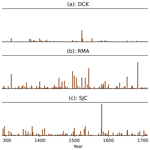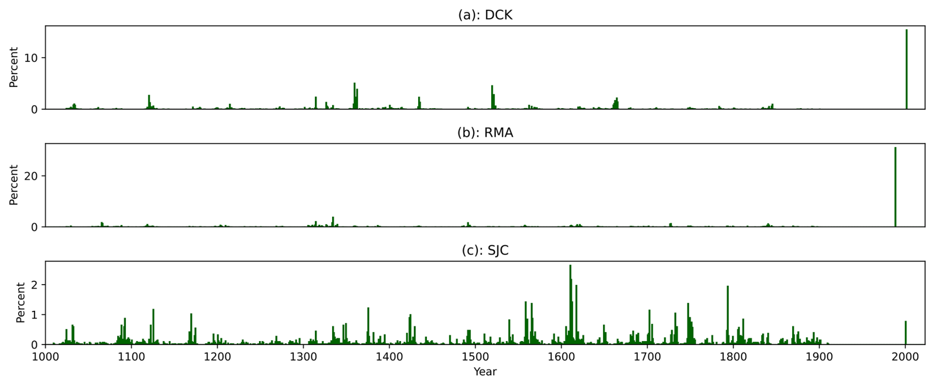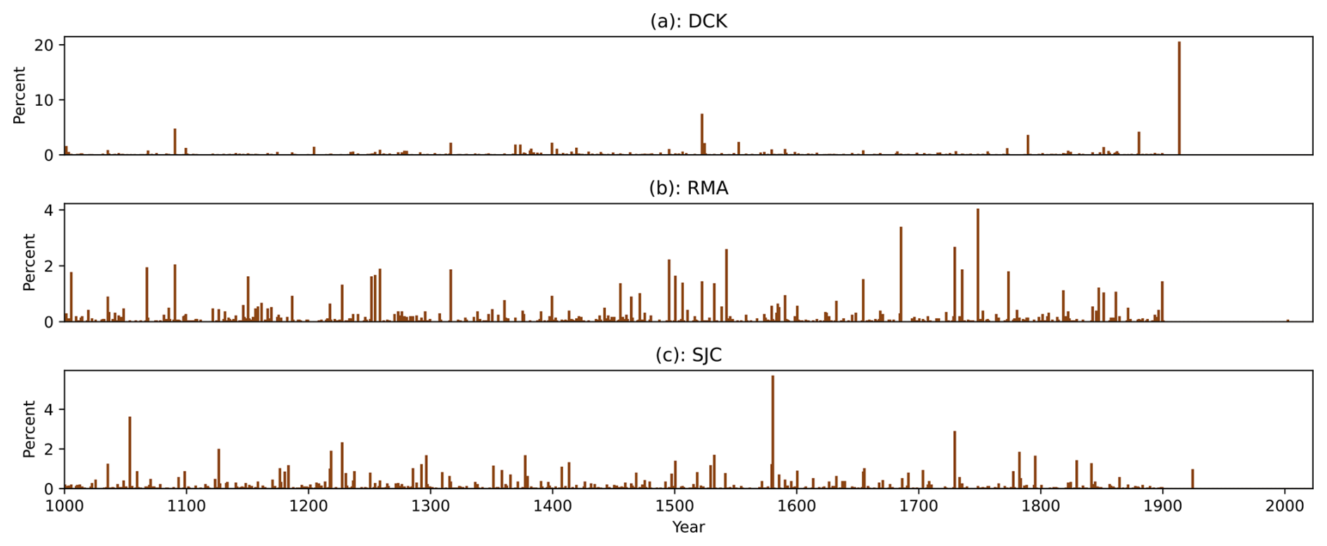 Figure 12Wettest decades on record. Panel (a) shows the probability of a given ten year mean being the wettest (highest precipitation) decade since 1000 CE in Dodge City, Kansas. Years on the x-axis correspond to the end of the ten year period. Panel (b) shows the same for Red Mesa, Arizona. Panel (c) shows the same for Sonora Junction, California.