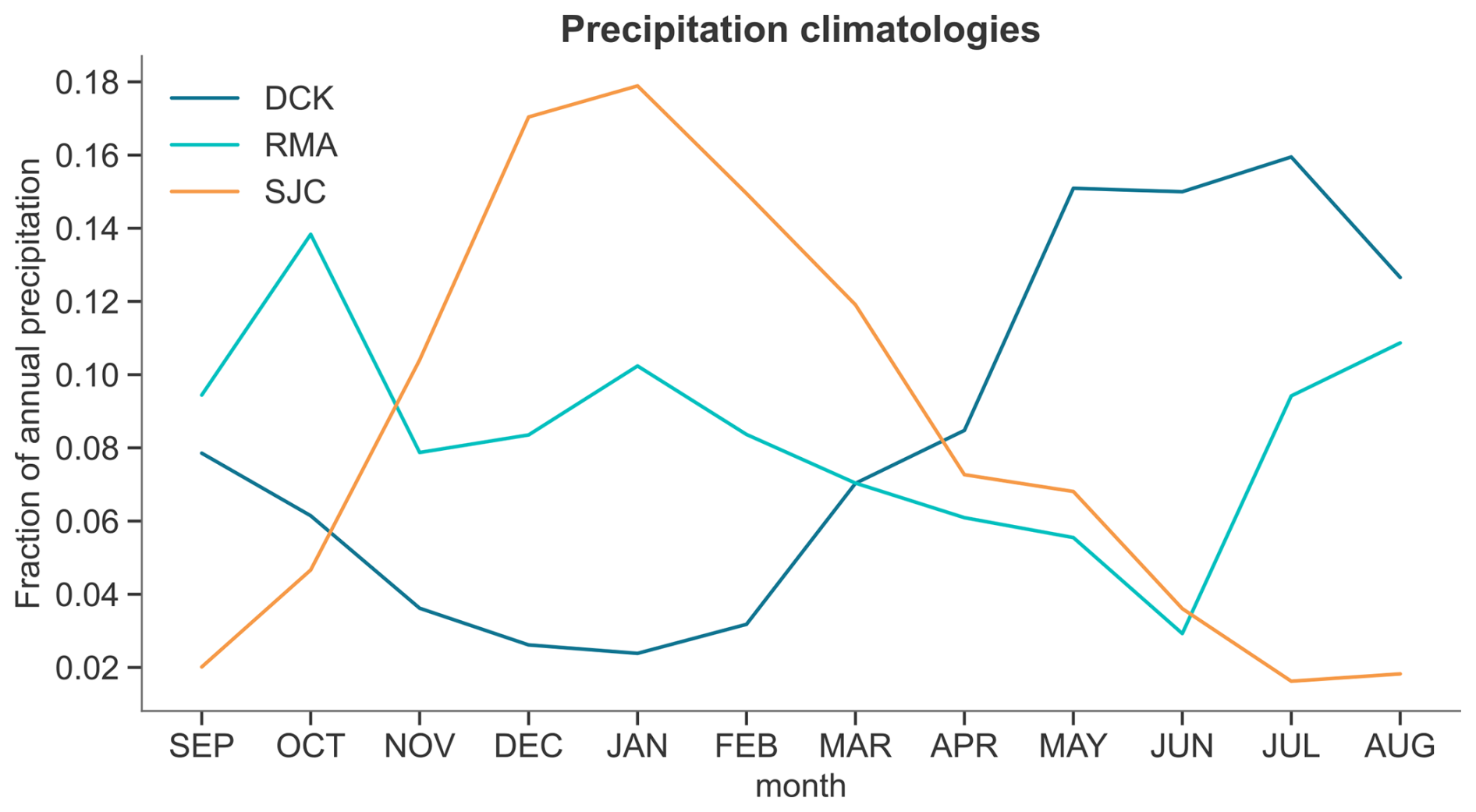 Not only are these locations hotspots of past drought activity, the climatologies of precipitation differ greatly across these three sites: in DCK precipitation is highest in spring and summer, in SJC almost all precipitation arrives in the winter, and in RMA precipitation is more evenly distributed throughout the year (Fig. 1).