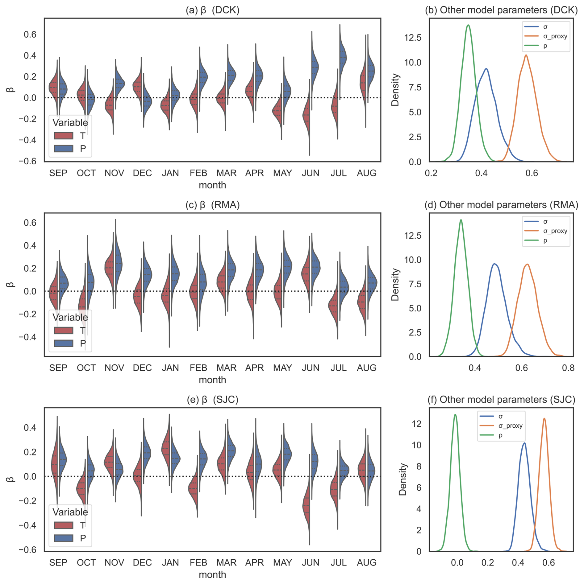 In SJC, the vast majority of precipitation occurs in the fall, winter and spring, and thus the posteriors for β are strongly positive in these months (Fig. 2e). While very little precipitation typically falls in June, any amount of rainfall in the early summer can strongly influence JJA D, and the posterior distribution of β for June is also shifted to positive values. High May and June temperatures in this region are strongly associated with drier D. Interestingly, the posterior for ρ in this region is not substantially shifted away from zero; D in SJC does not appear to depend strongly on its previous value, at least during the training period.