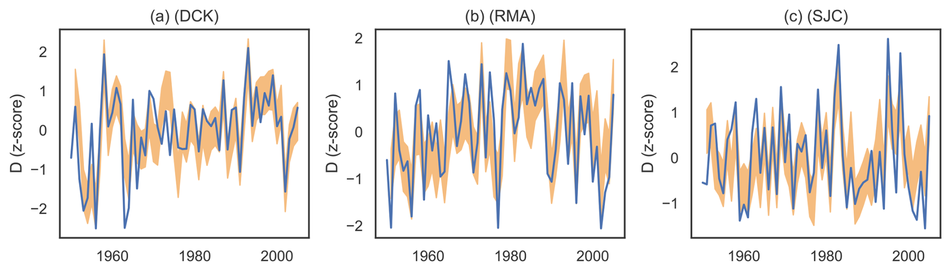 Applying a ten-year rolling mean to the posteriors for P allows us to calculate the decades in which precipitation was lowest. In DCK, there is a 71 % chance that 1931–1940 was the driest (lowest precipitation) decade on record: interesting, because the 10 year window with lowest average D in the NADA is 1855–1864. No one ten-year period particularly stands out as the driest on record in RMA: the most-often identified decade 1142–1151 is the driest ten-year period in 3 % of the samples, corresponding to a notable megadrought in the southwestern US. In SJC, there is a 37 % chance that 1924–1933 was the driest ten-year period on record.