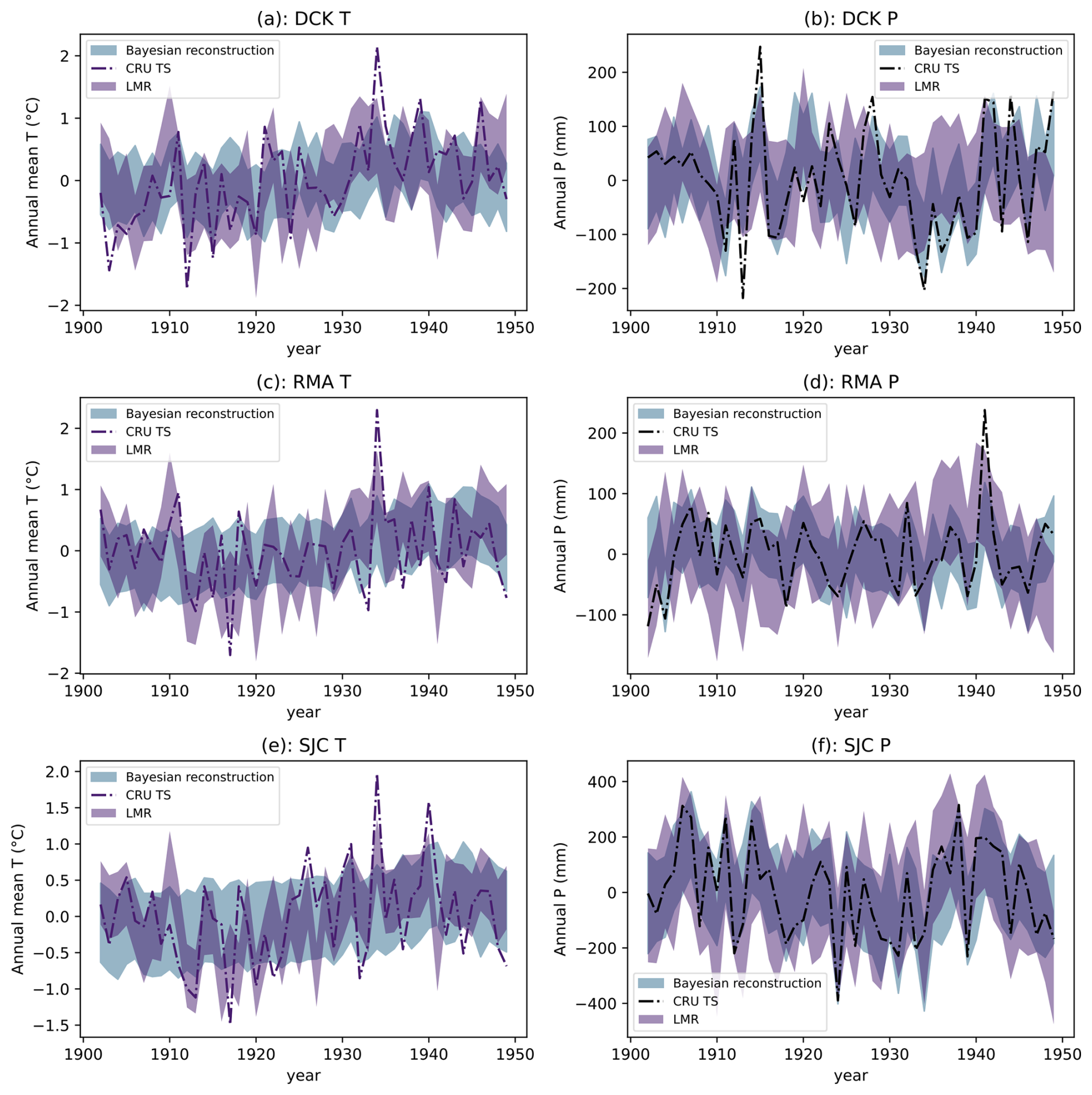 In RMA, 1902 was the driest year in the precipitation instrumental record. The reconstructed posterior suggests lower-than-average precipitation and slightly lower-than average temperature; the instrumental data indicates roughly average temperatures and well-below average precipitation (Fig. 7b).