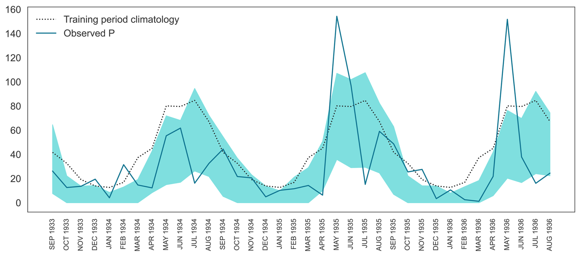 Annual averaging of the reconstructions reduces uncertainty, but the monthly precipitation reconstructions still appear somewhat skillful. Figure 6 shows the likely range of the reconstructed monthly precipitation, the instrumental monthly precipitation, and the instrumental climatology over the training period over three years at the height of the Dust Bowl drought.