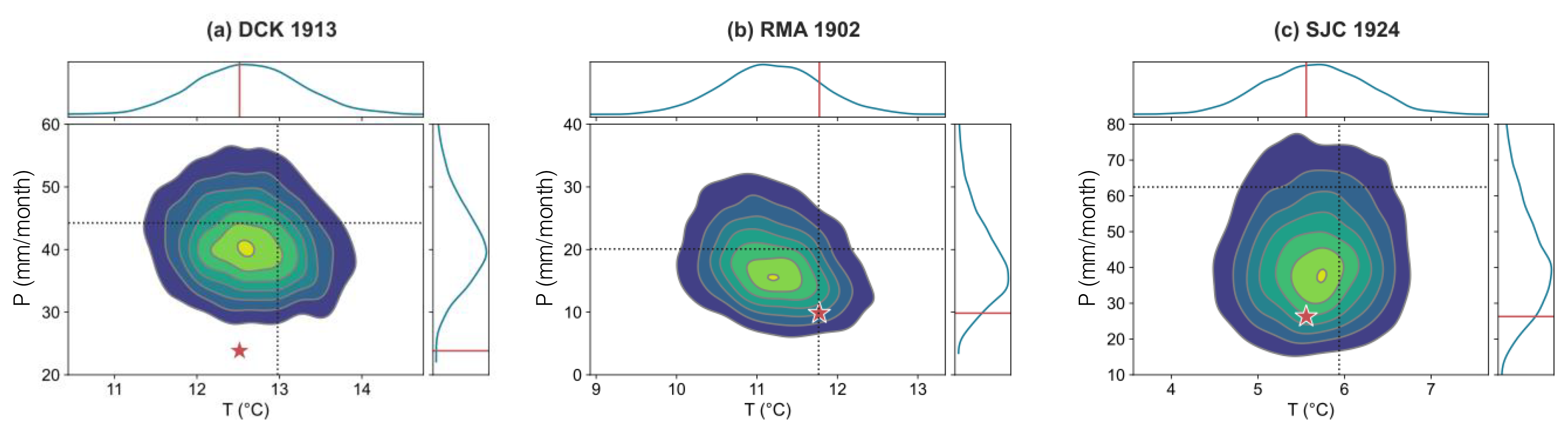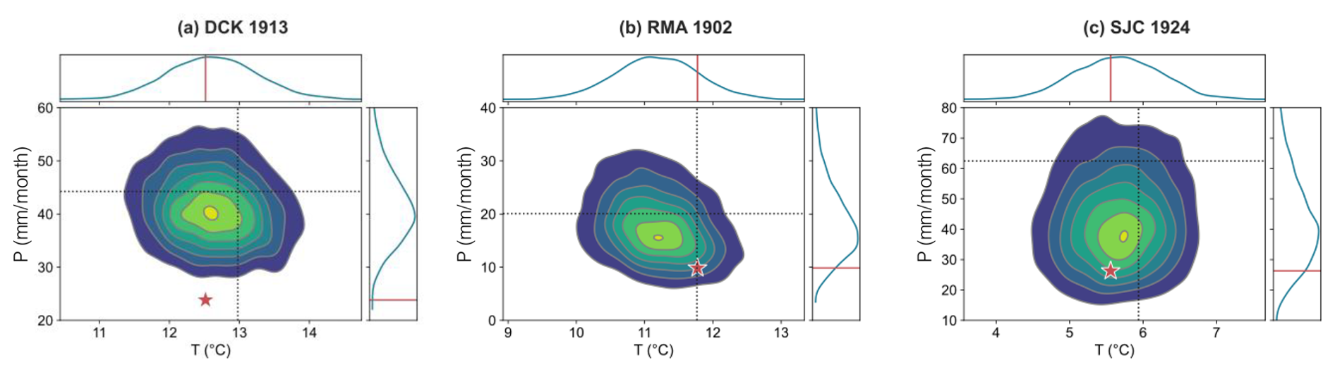 In SJC, 1923 was the driest year, and the reconstructions suggest far-below-average precipitation and slightly below-average temperature. The instrumental data lie near the center of the reconstructed posterior (Fig. 7c).