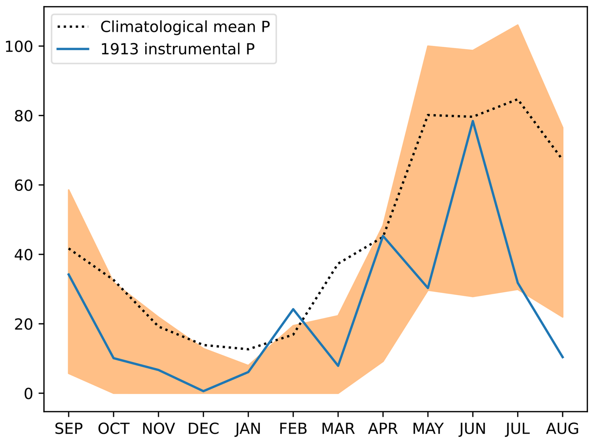 1913 was the year of lowest recorded precipitation in DCK, despite being slightly colder than average. Our reconstruction model suggests that both annual mean rainfall and temperature were both slightly below normal, although it tends to underestimate the magnitude of the precipitation anomaly (Fig. 7a). The instrumental temperature lies well within the likely range of temperatures reconstructed by the model. However, while the reconstructions indicate lower-than-average precipitation, the instrumental value lies in the far tail of the reconstructed posterior (right-hand marginal plot, Fig. 7a). This is likely because the NADA records a D that is less than 0.2 standard deviations below the mean, possibly due to near-average rainfall in April and June 1913 (Fig. 8).