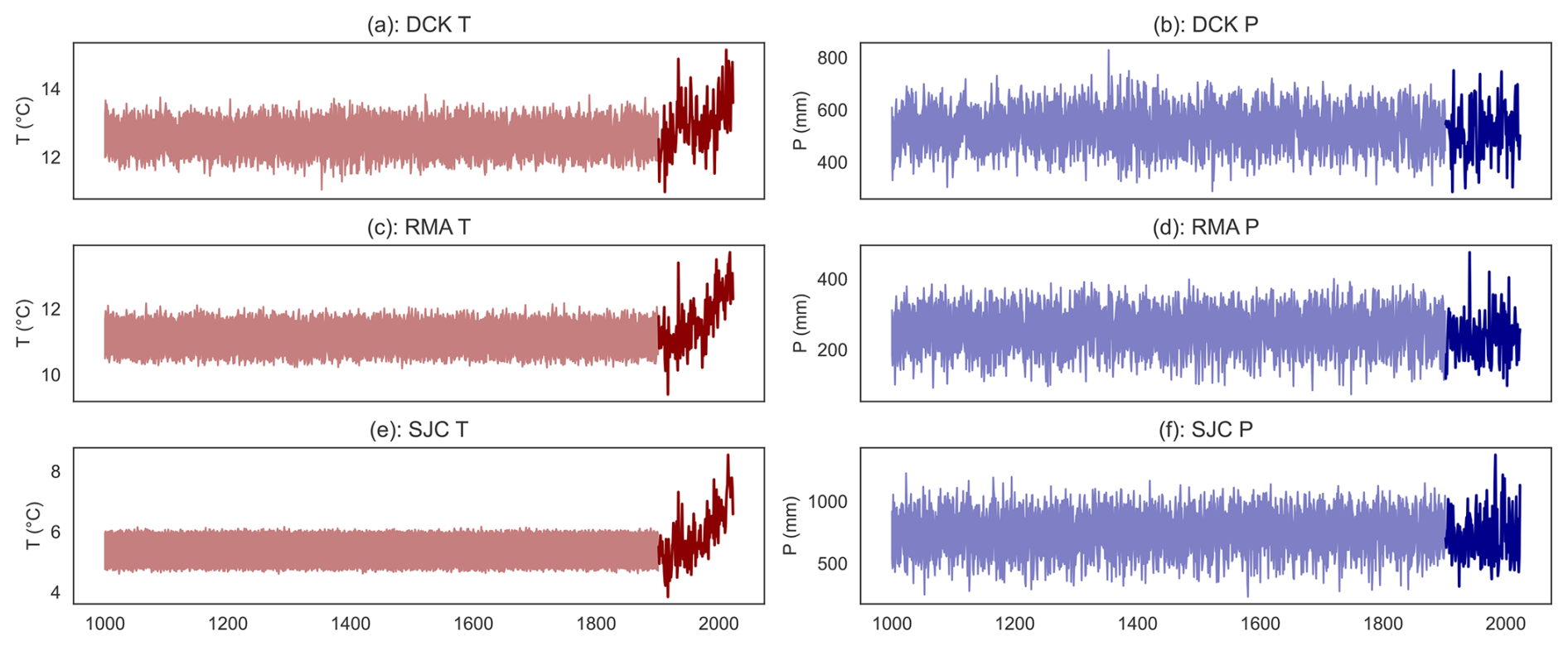 To demonstrate our method, we choose to reconstruct monthly temperature and precipitation from the NADA in the grid cells closest to three locations: