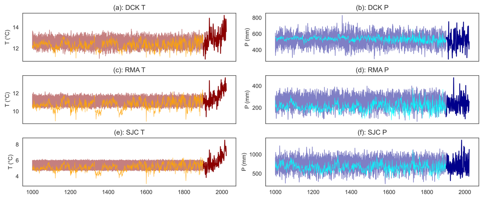 Figure 9Last-millennium reconstructions show more interannual variability in precipitation than in temperature. Panel (a) shows the reconstructed likely (66 % HDI) range of temperature (red shading) and precipitation (blue shading) over 1000–1901 for Dodge City, Kansas. Instrumental (CRU TS) measurements from 1901–2023 are shown as solid lines. Panels (c) and (d) show the same quantities but for Red Mesa, Arizona. Panels (e) and (f) show the same quantities for Sonora Junction, California.
