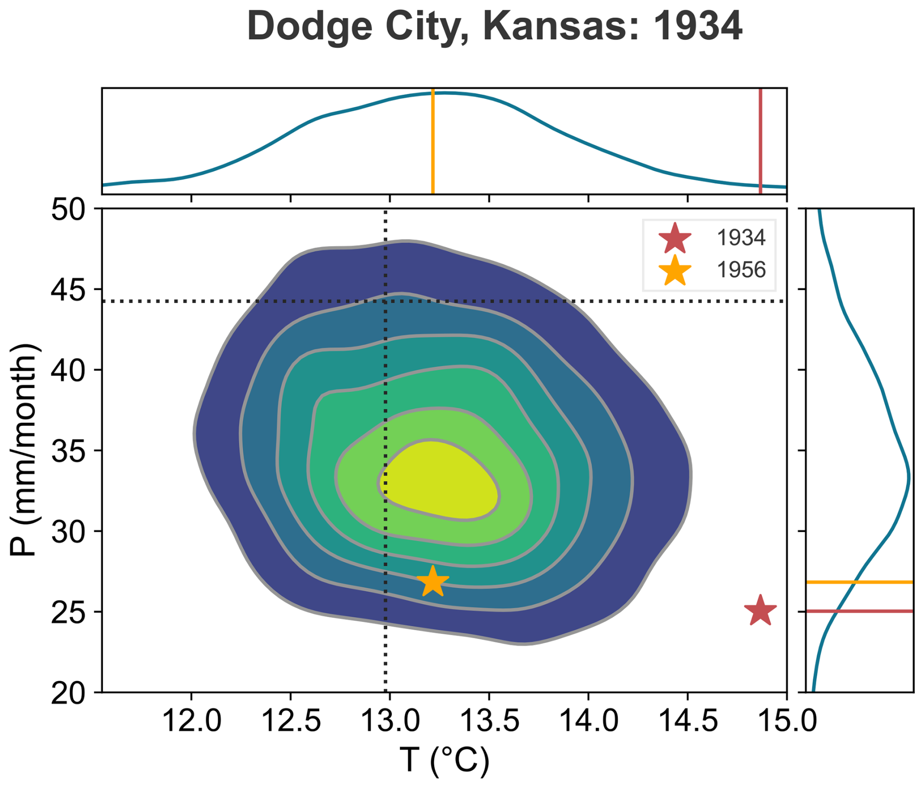 Figure 131934 was an exceptionally hot drought in Dodge City. Shown is the joint posterior PDF for reconstructed annual (September–August) DCK temperature and precipitation in 1934 (contour lines). Marginal PDFs are shown on the top (for T) and right (for P). Annual mean climatologies are shown as dashed lines. Instrumental annual mean temperature and precipitation for 1934 is shown as a yellow star. Instrumental T and P for 1956 is shown as a yellow star. Red/yellow lines on the marginal PDFs indicate 1934/1956 T (top) and P (right).